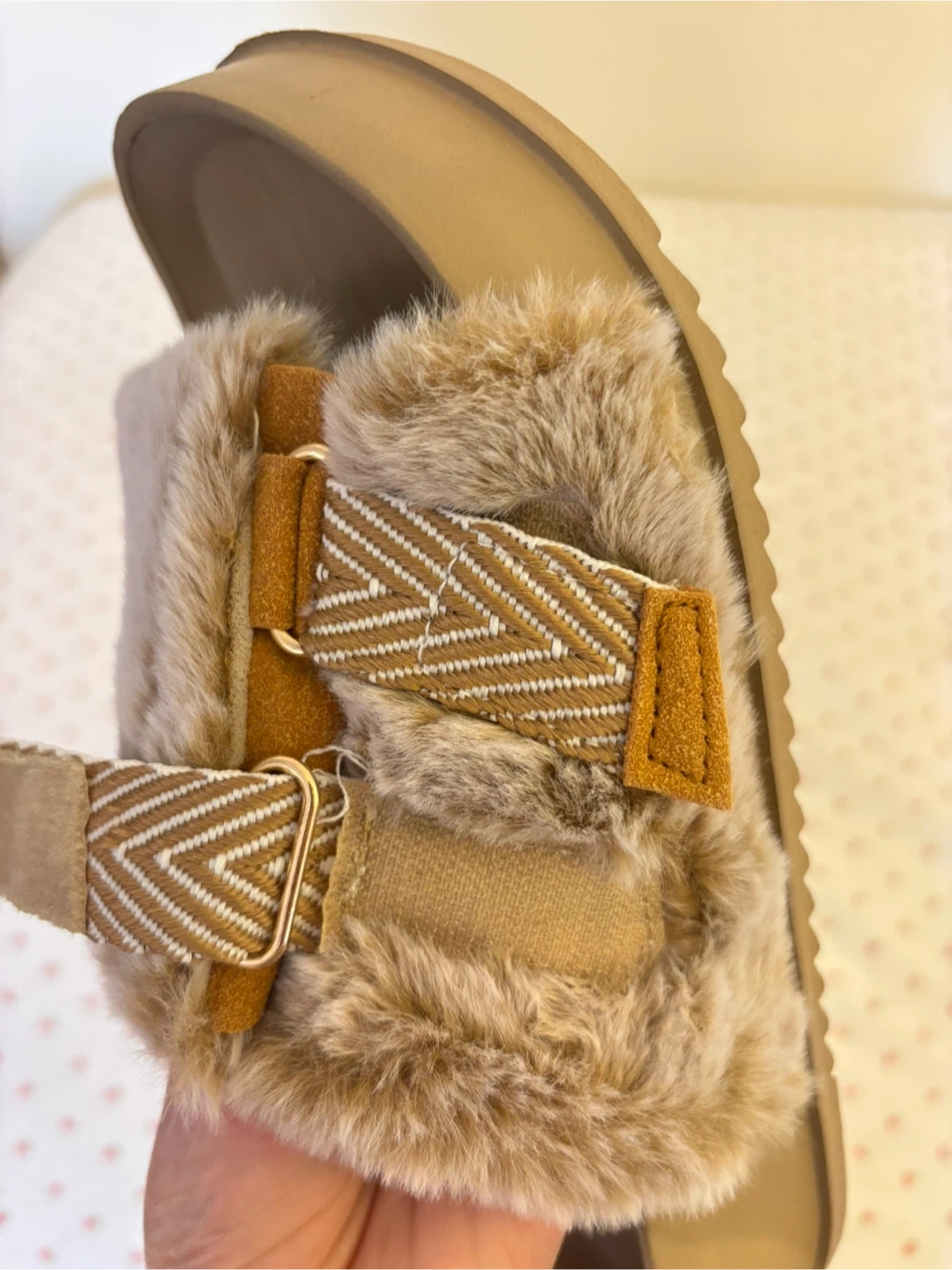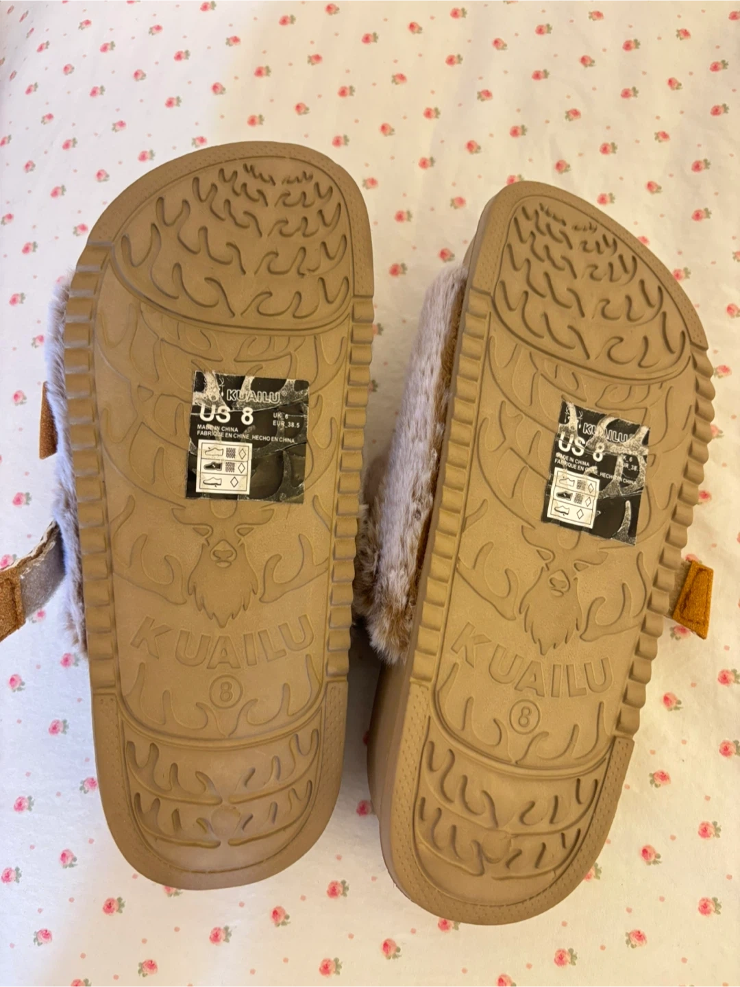 Cozy KUALIU slides with faux fur lining and adjustable straps. Perfect for lounging around the house or quick errands. Usable indoors and out!