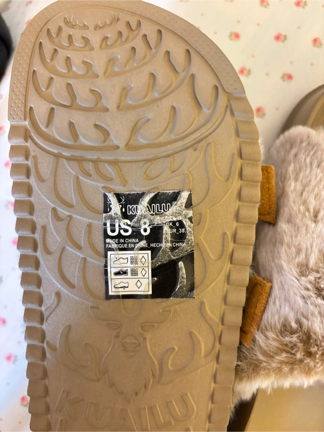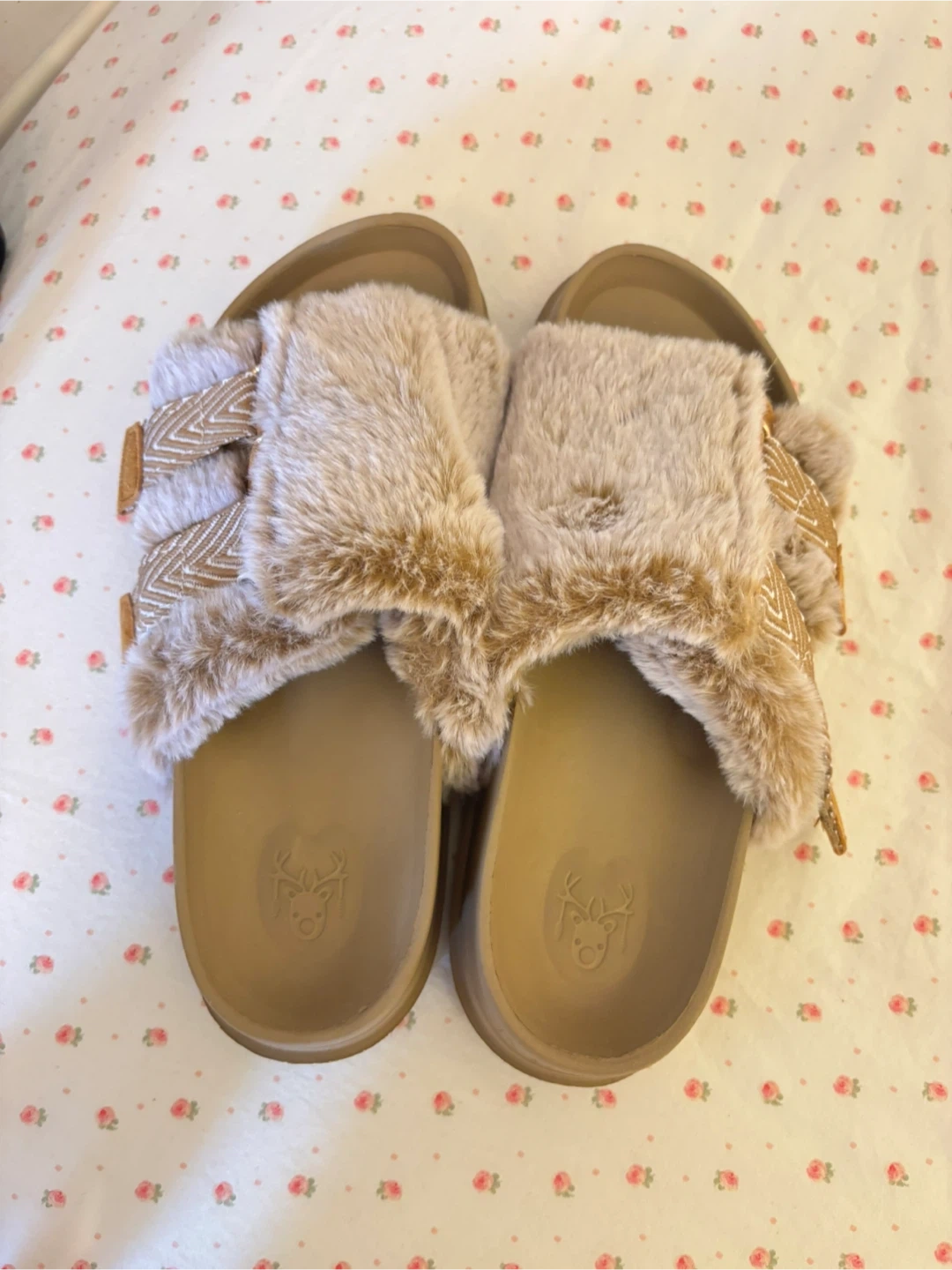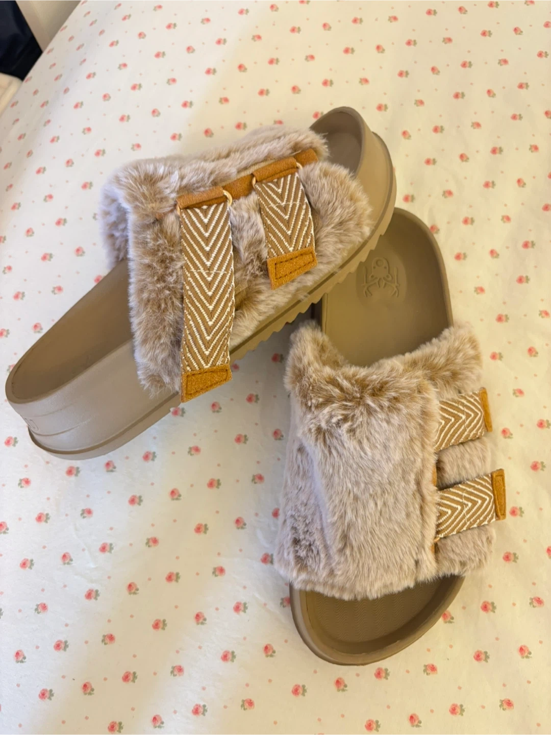 Cozy KUALIU slides with faux fur lining and adjustable straps. Perfect for lounging around the house or quick errands. Usable indoors and out!