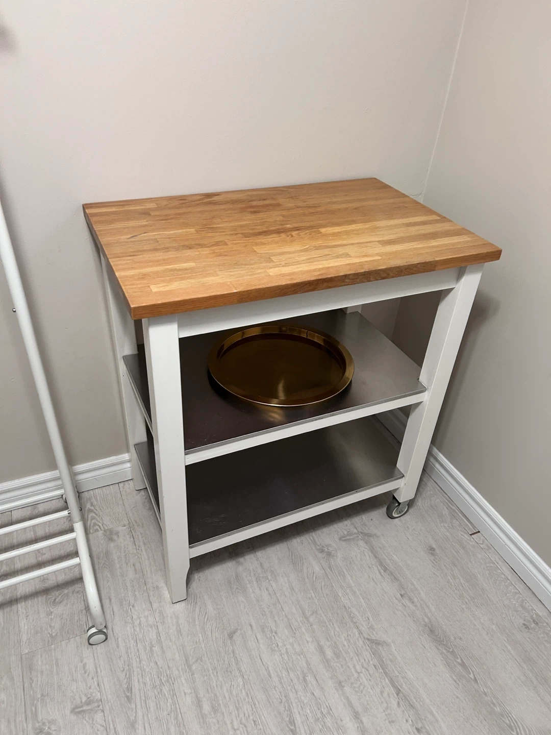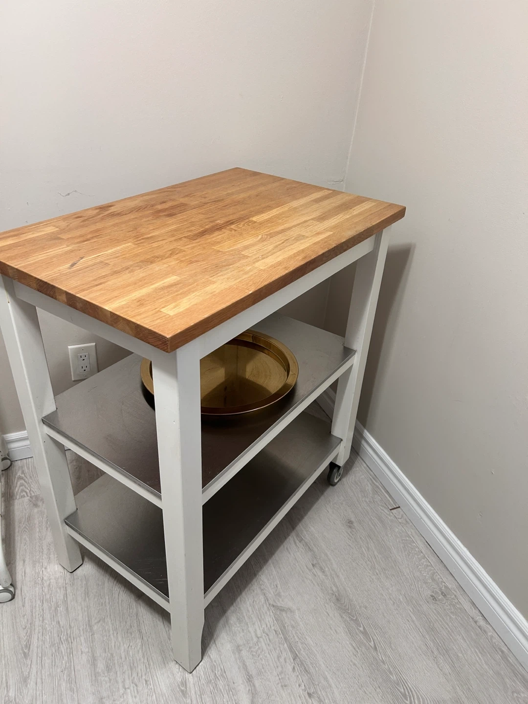 This kitchen island cart features a durable wooden top and two metal shelves for ample storage. It's designed with white side panels and castor wheels for easy mobility. Great for extra prep space or storage in your kitchen!