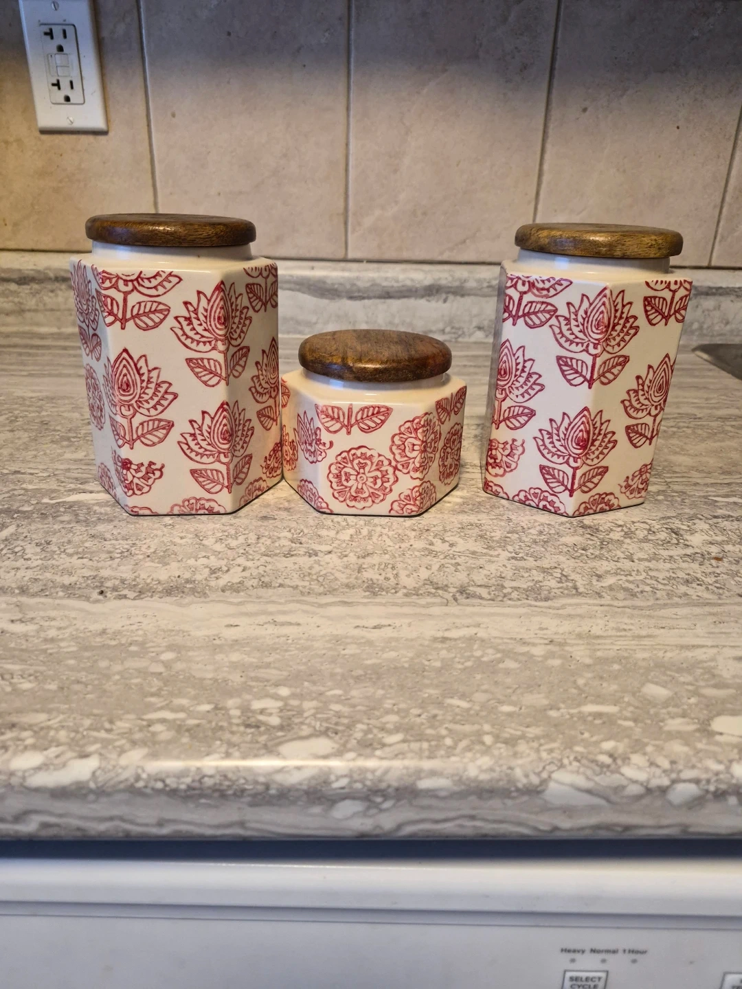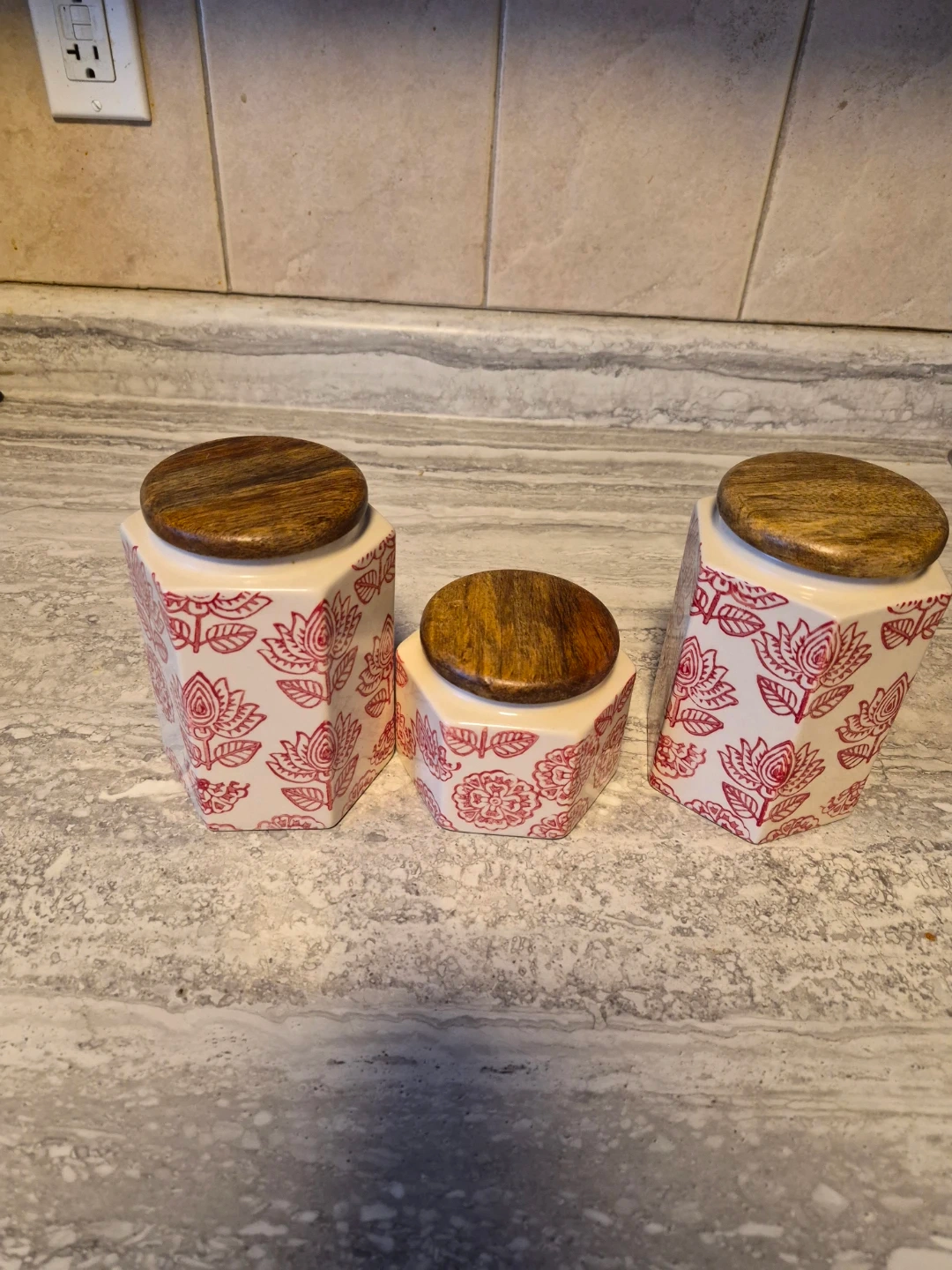 A set of three ceramic storage canisters, each featuring a red floral pattern and a rustic wooden lid. These jars are perfect for storing kitchen staples like flour, sugar, or coffee beans. The different sizes offer versatile storage options for your pantry.