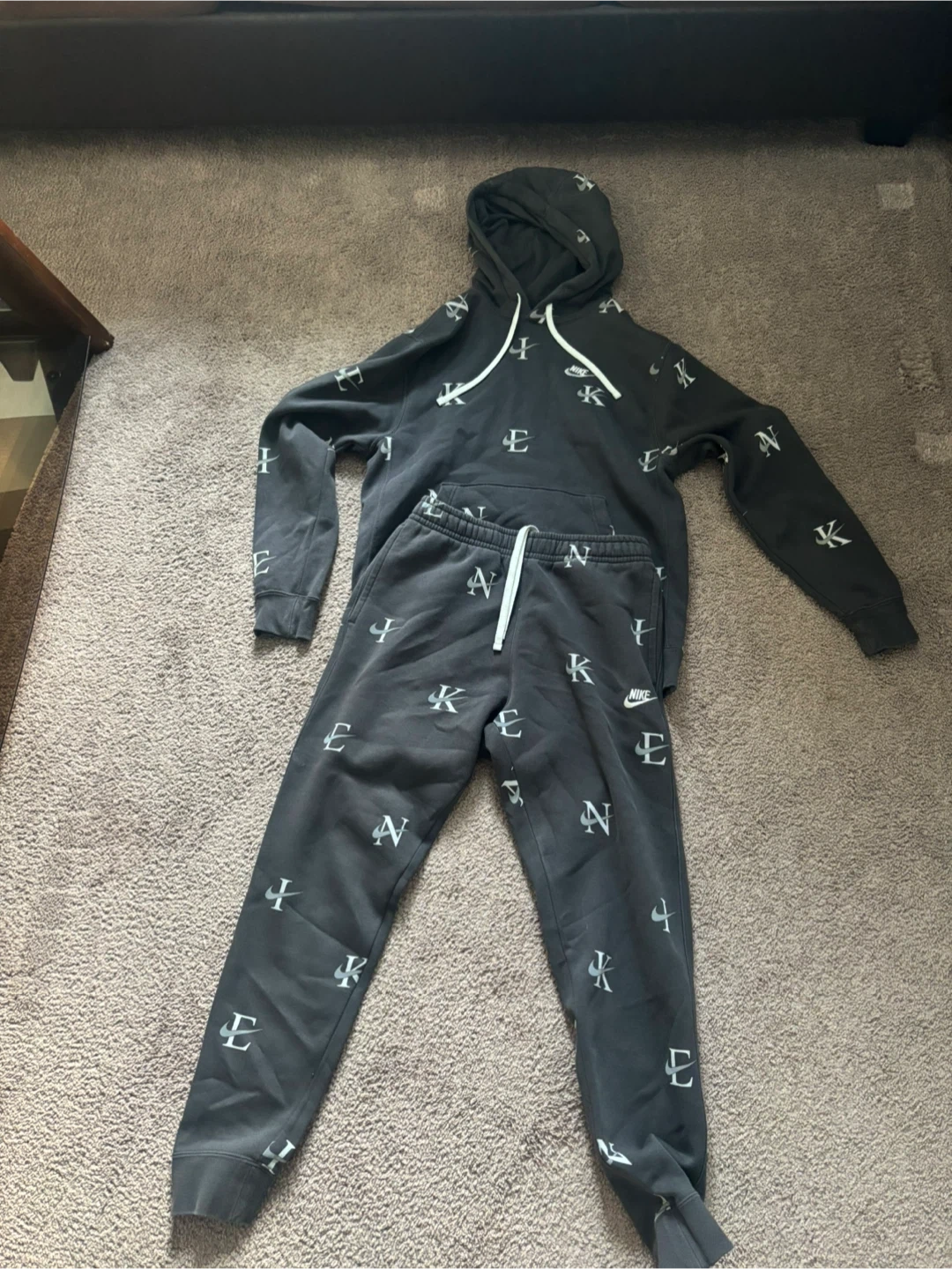 This is a Nike hoodie and matching pants set. The material is soft and comfortable for everyday wear. Size is medium and both pieces are made in Cambodia.