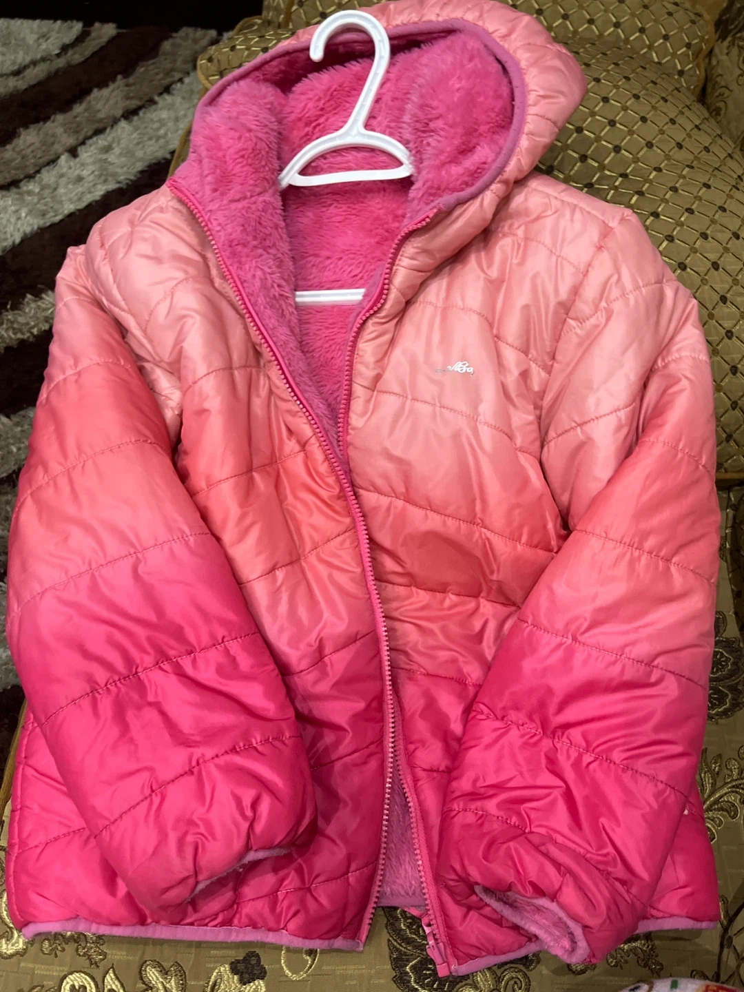 This girls' puffer jacket reverses from a shiny pink ombre to a cozy pink sherpa lining. It features a full zipper and a hood for extra warmth. This jacket is great for cooler weather!