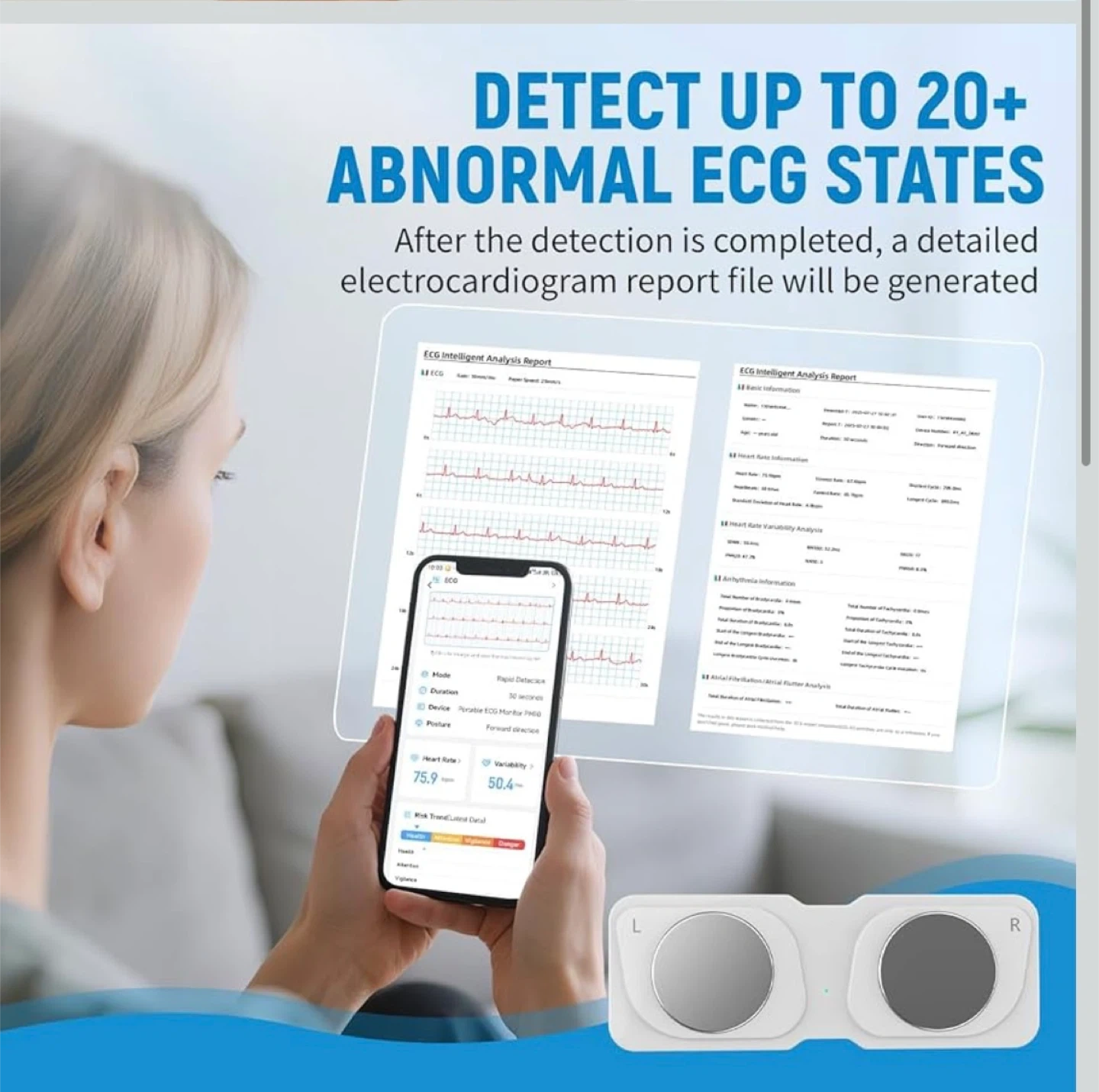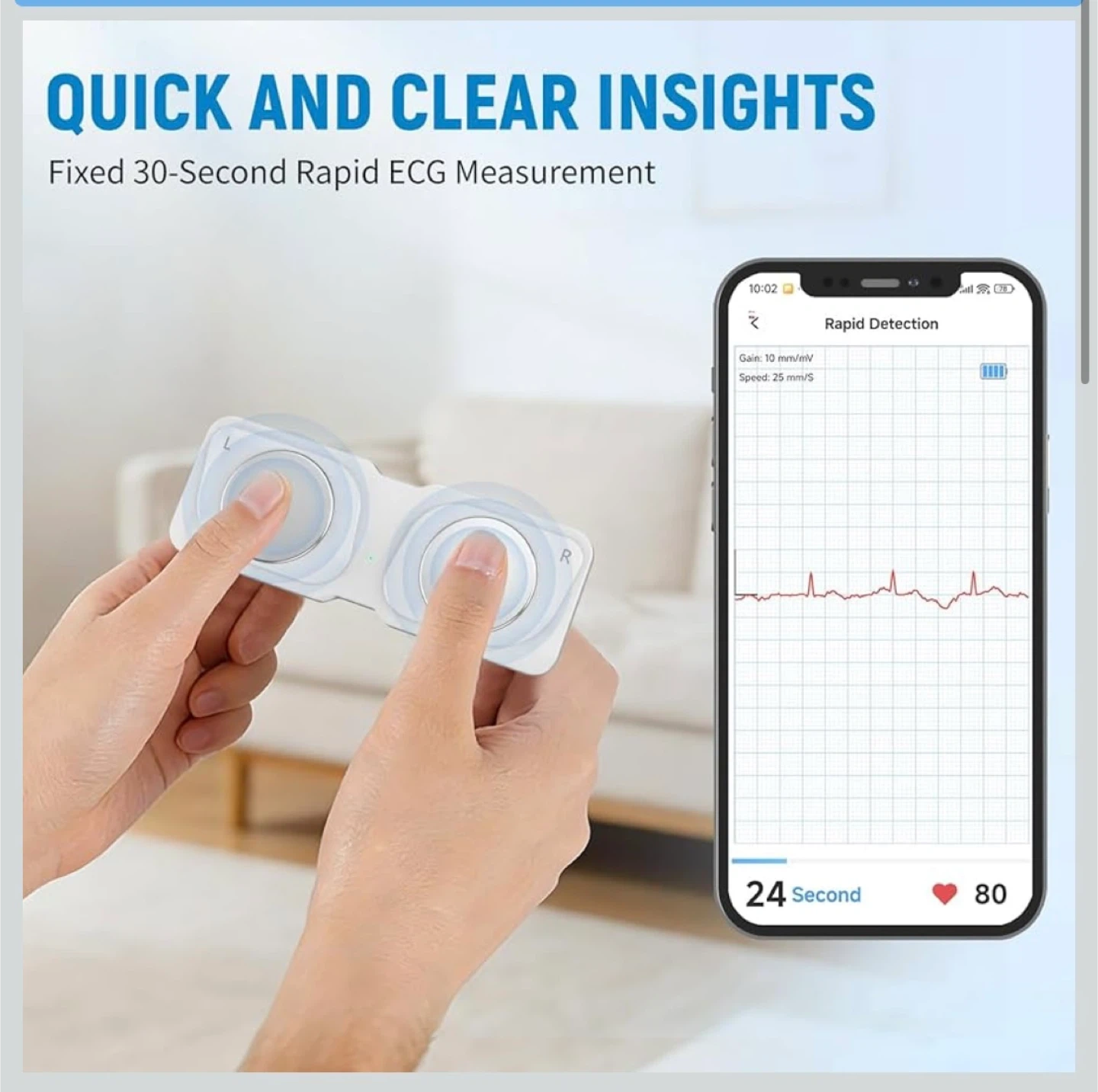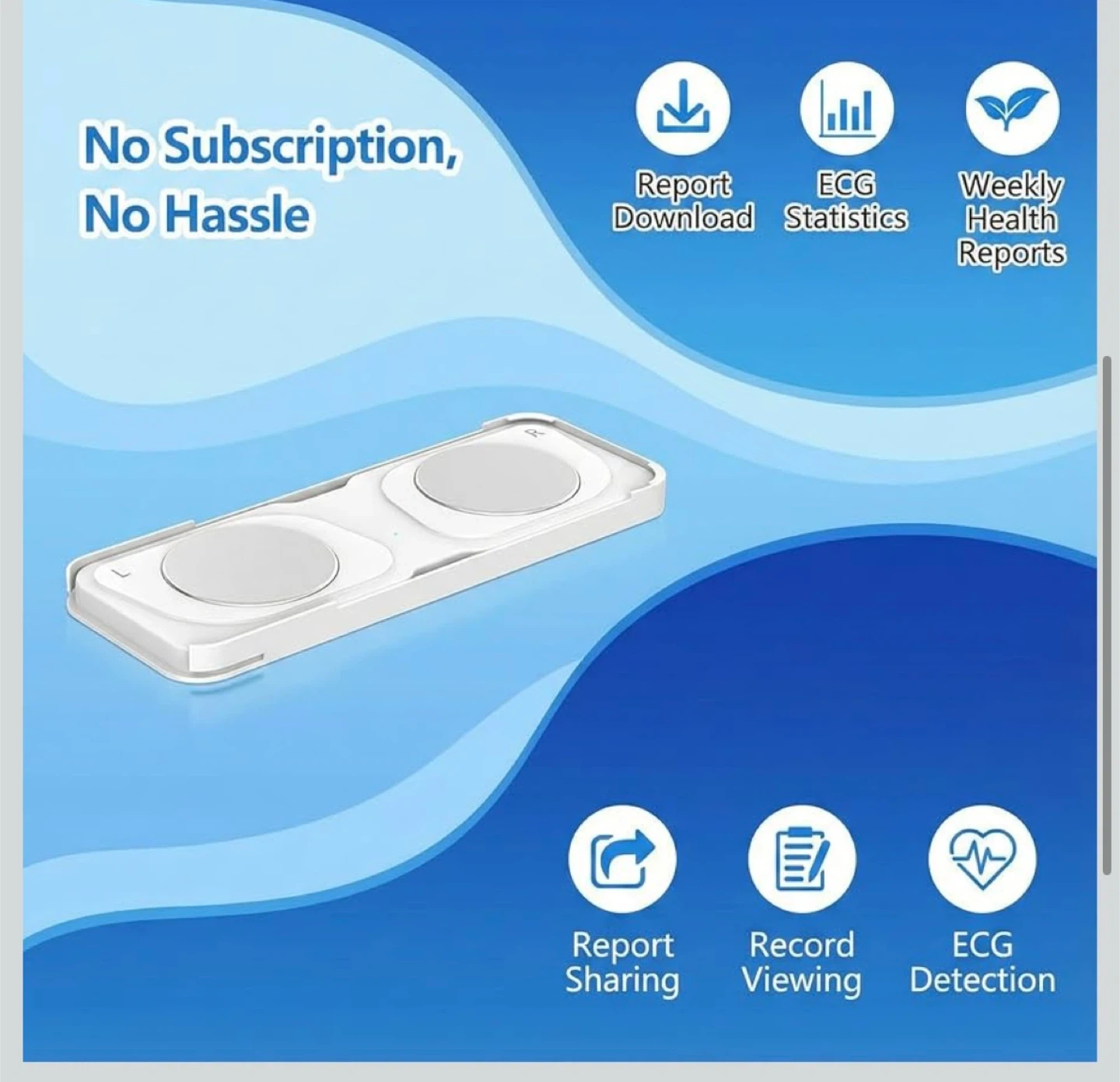 This portable ECG monitor provides quick and clear insights with fixed 30-second rapid ECG measurements. It's compact and designed for easy use at home, during travel, or for sports. No subscription is needed, and it offers report downloads and weekly health reports.