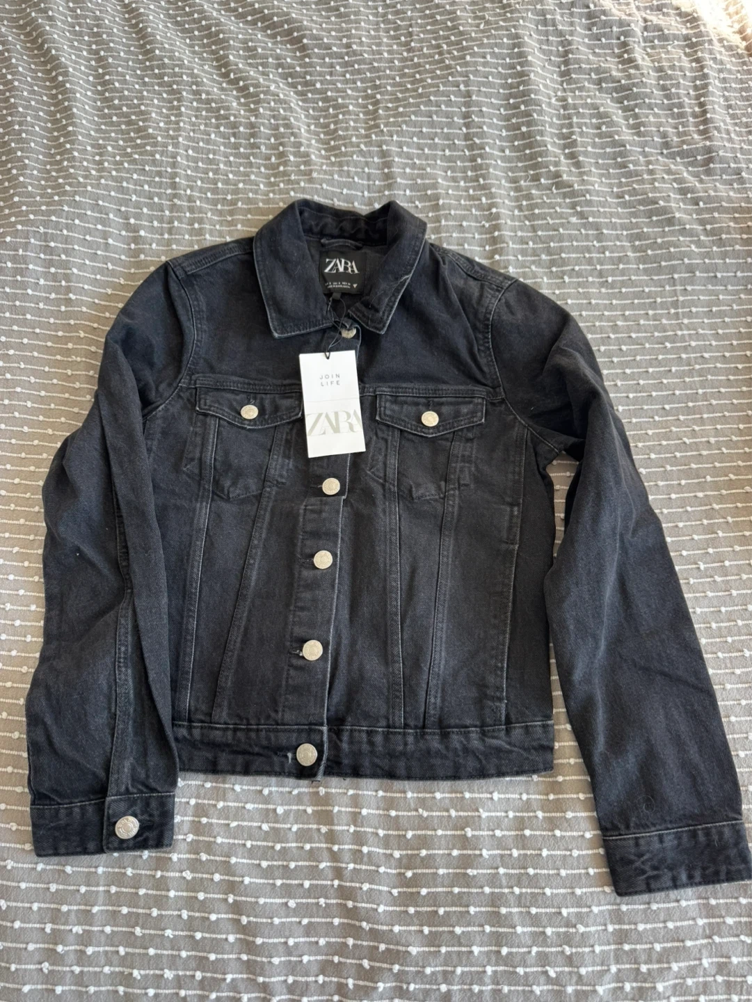 ZARA black denim jacket. Includes original tags. Size S , close fit. Made with at least 95% ecologically grown cotton. Button closure and cuffs. 4 pockets. New. Never worn. Bought for a project but didn’t use. This is a close fitted fit.