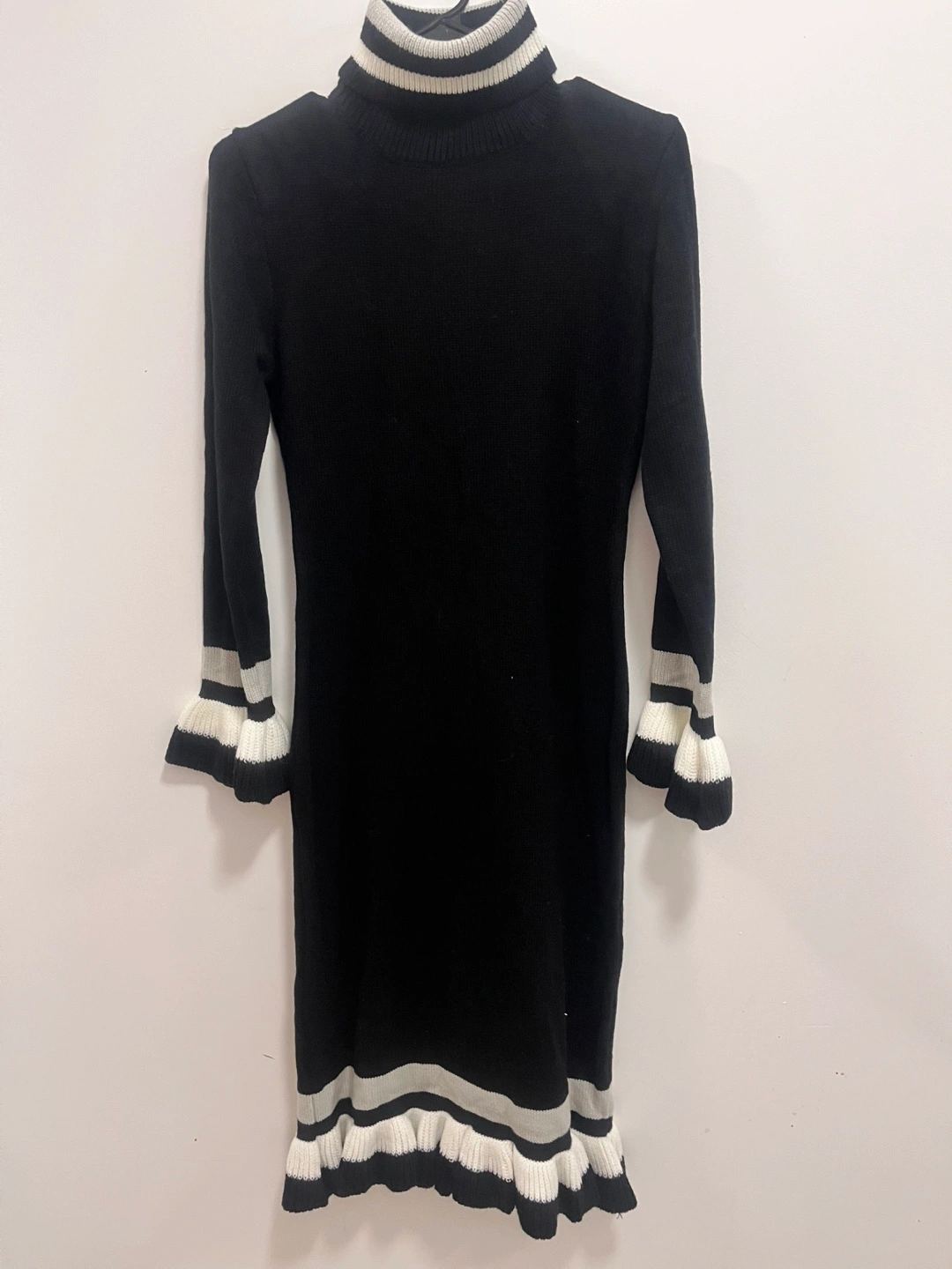 Form-fitting midi dress. Black knit material. White ribbed detailing at cuffs and hem. High turtleneck. Long sleeves. Excellent condition.