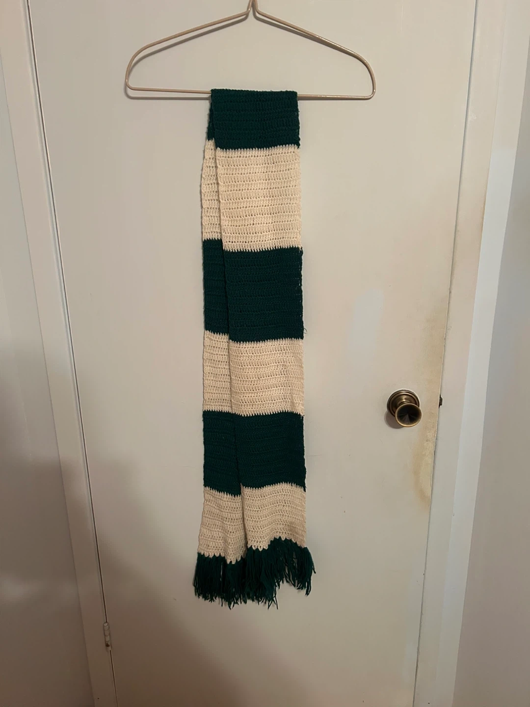 Cozy handmade scarf, perfect for keeping warm during the colder months! It features a striped pattern in green and beige, with fringe detailing at the ends. A great addition to any winter wardrobe!