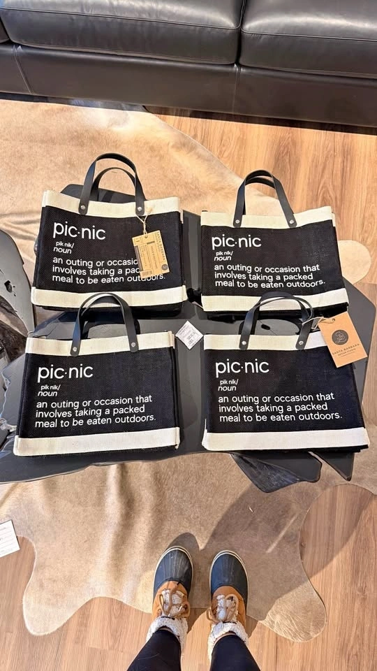 Selling a set of FOUR matching picnic tote bags. Perfect for girls’ trips, lake weekends, winery tours, beach days, or group gifting. Each bag features a classic black & natural canvas design with leather-style handles, pocket inside and the definition print: “pic.nic (noun): an outing or occasion that involves taking a packed meal to be eaten outdoors.” Originally $65 each → $260 total value. Selling all four together for $160. Heavy-duty canvas, structured tote shape, leather-style handles, new with tags, pocket built inside. Perfect if you’re looking for a discounted group set or coordinating bags for a trip. Pickup at Urbanhome Interior Design – Windsor. Pickup between 10:00 AM – 4:00 PM Monday - Friday and select Saturdays. Cash or debit in store. No delivery. Final sale.