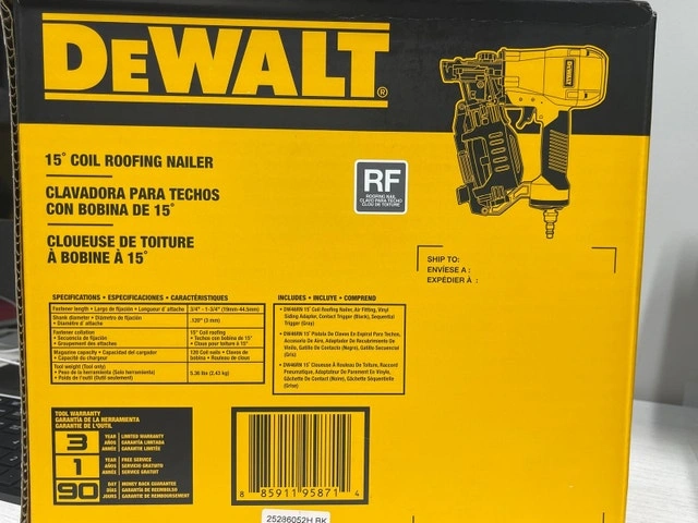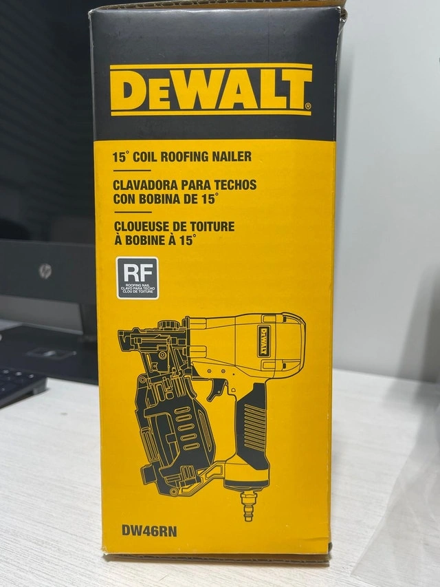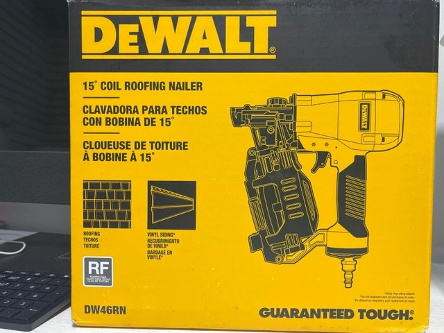 Brand new with box. This DEWALT DW46RN Coil Roofing Nailer is ideal for asphalt shingle roofing applications. It increases roofing productivity by allowing you to shoot 120 nails before reloading. Coil collated nails are compact and easy to load. Its ergonomic design is lightweight for easy handling. Pickup location: Islington and Rexdale, Etobicoke. Cash accepted. For sale by owner.