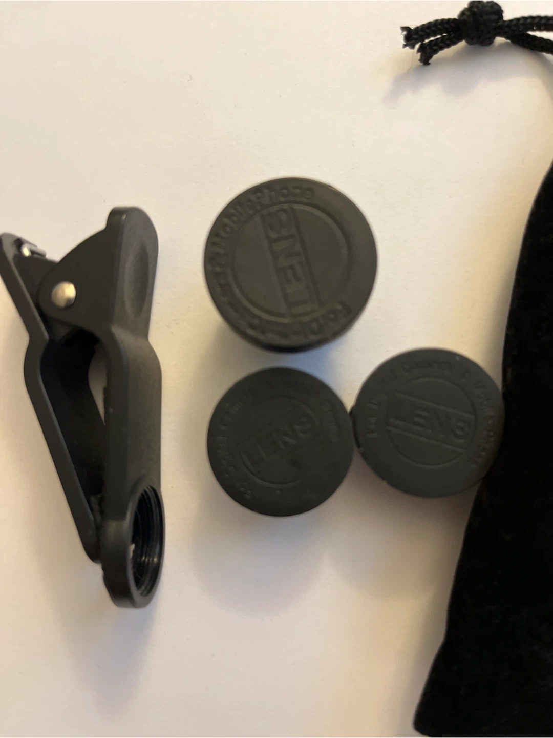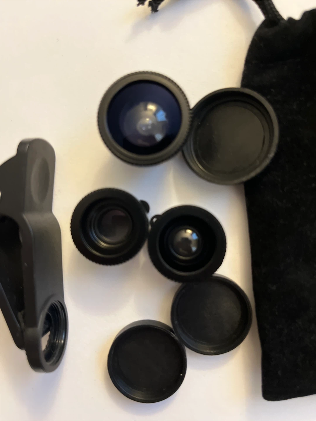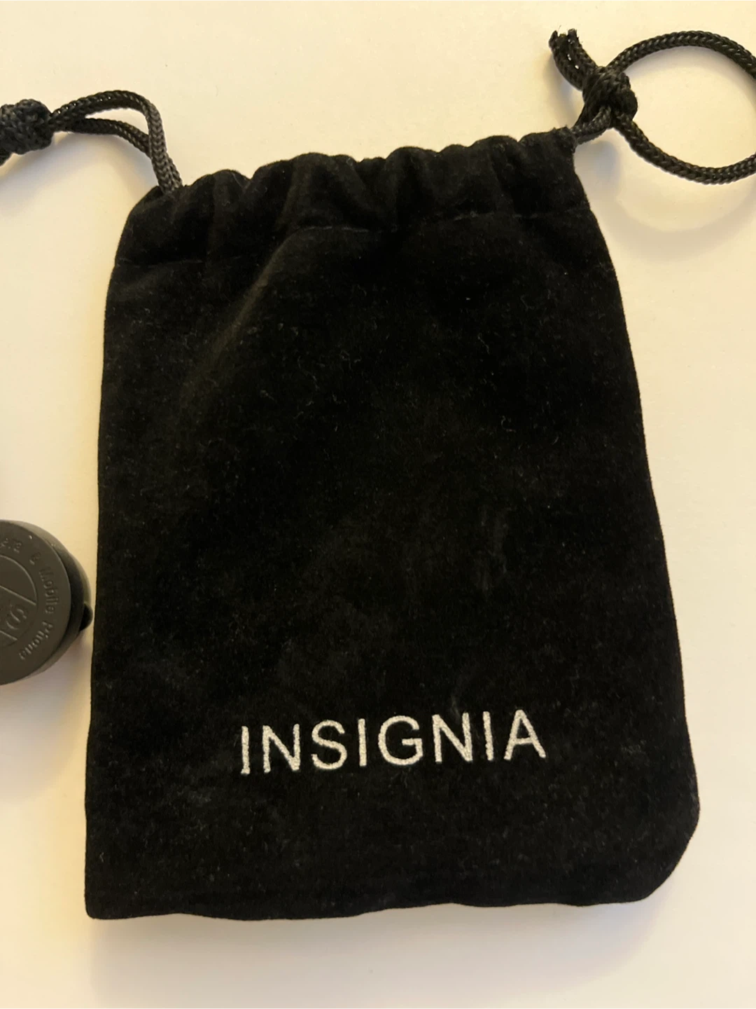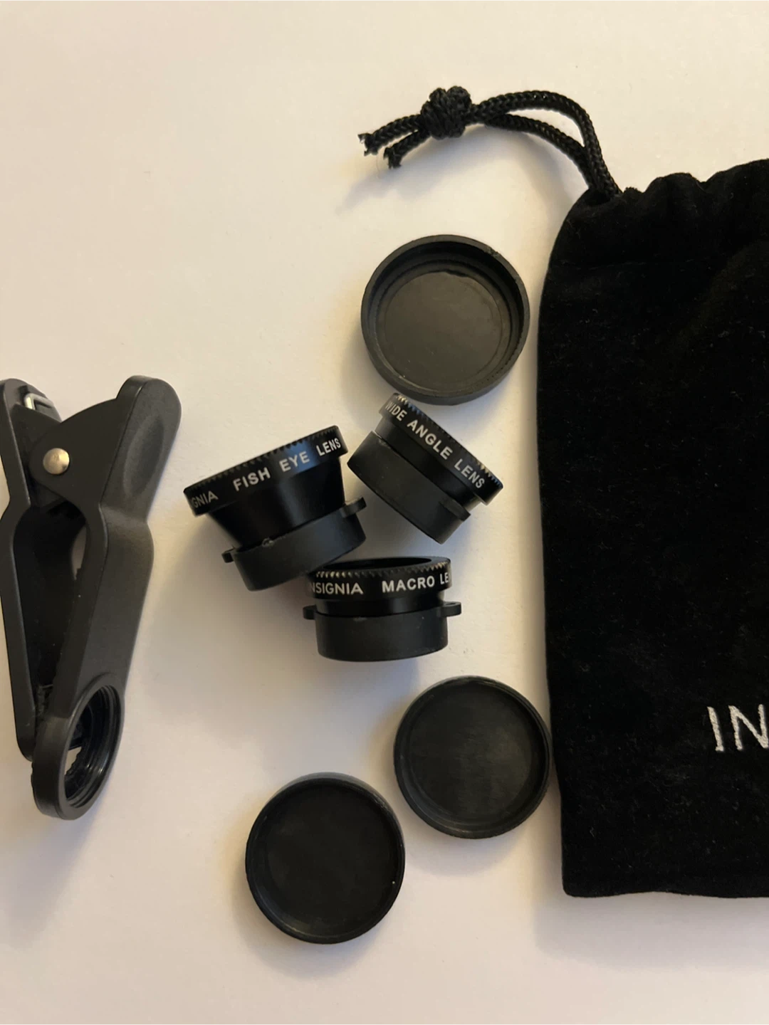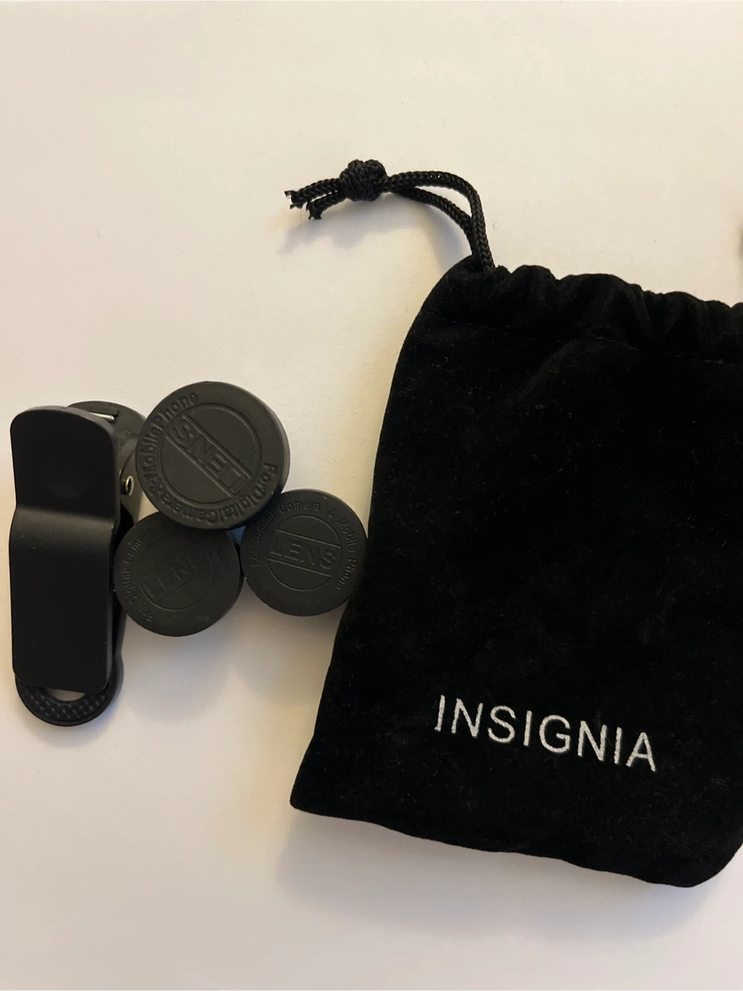 Insignia clip-on smartphone camera lens kit (macro / wide / fisheye style) with the original pouch.
