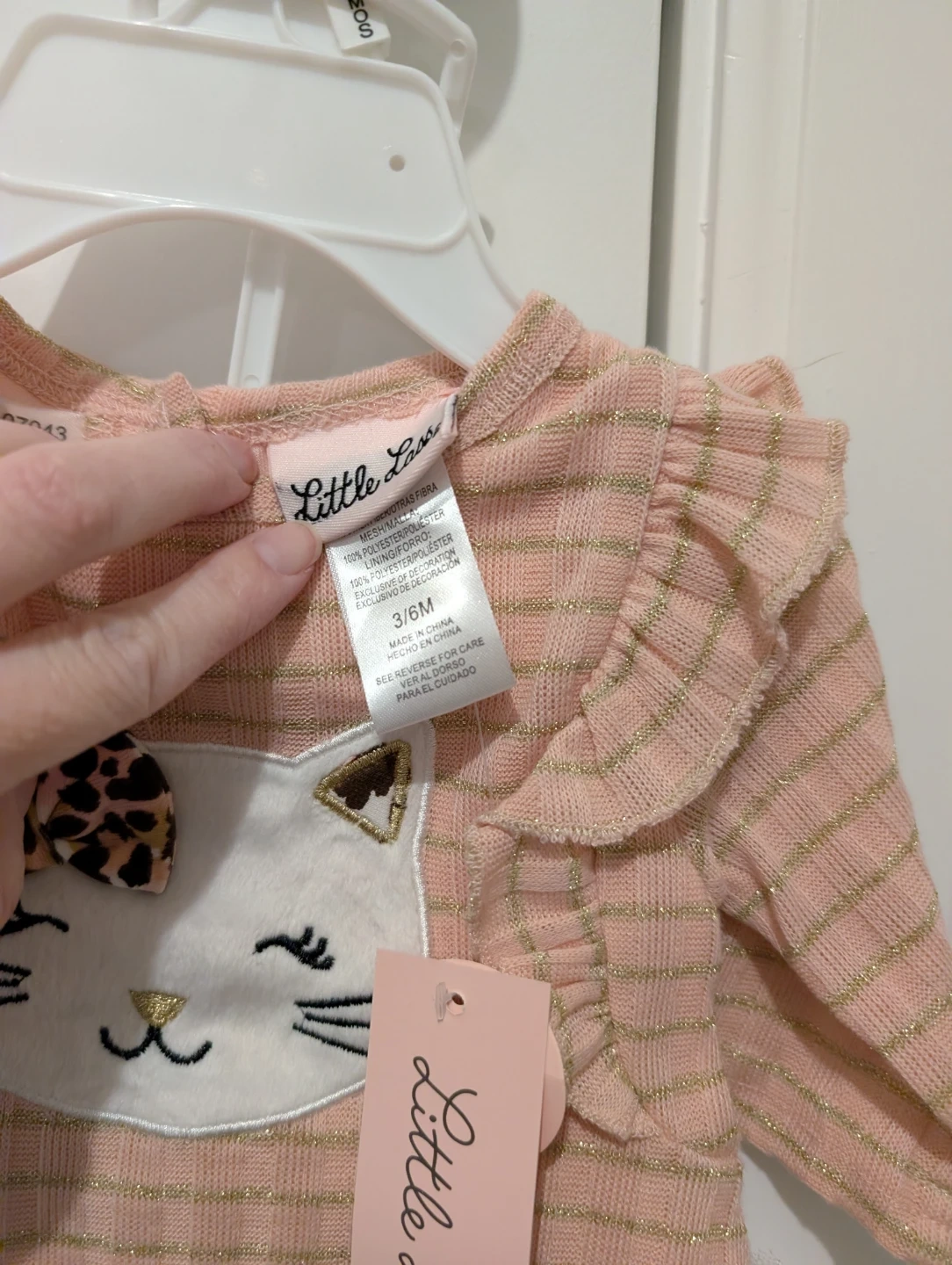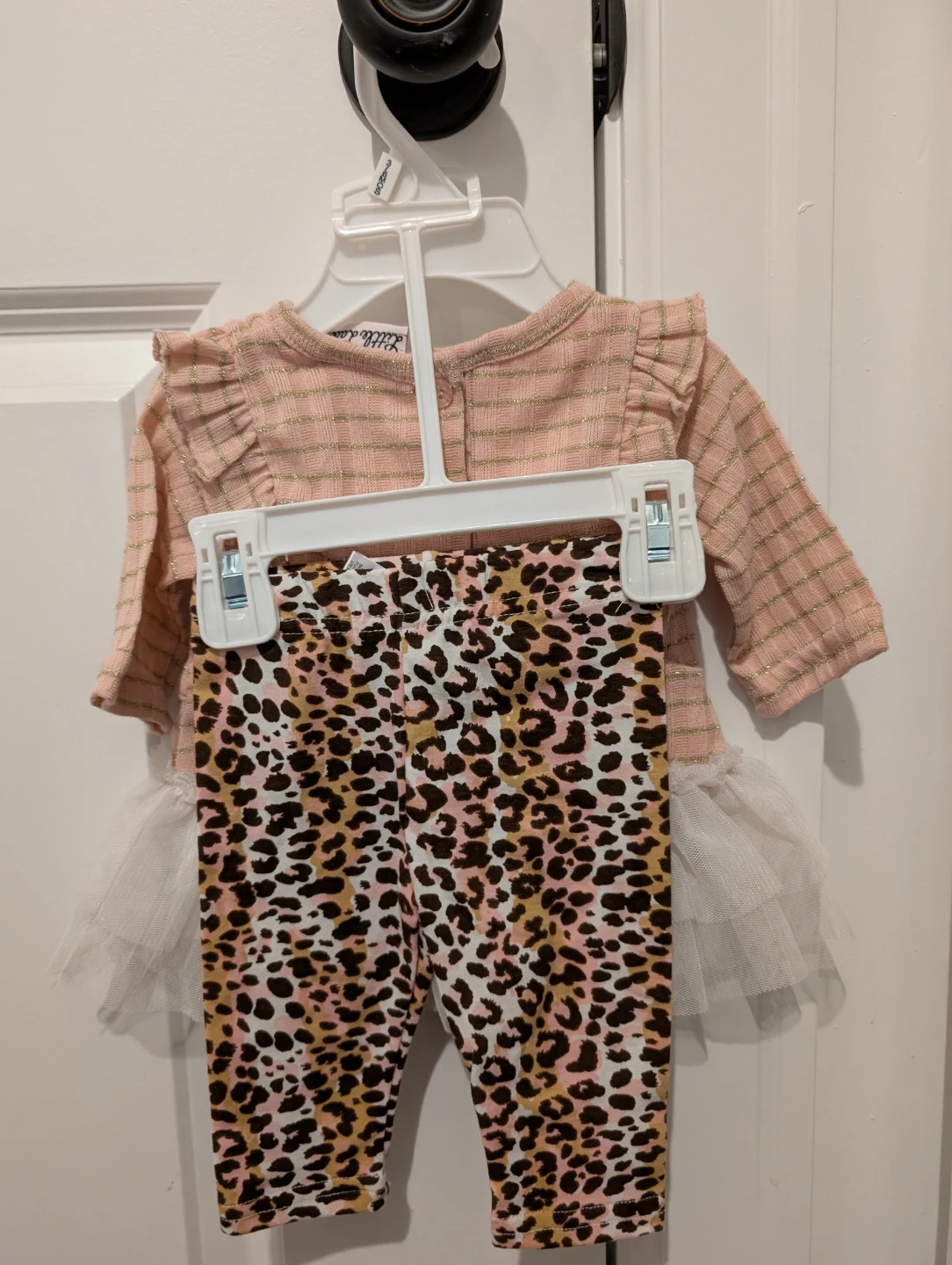 Adorably cute pink and gold striped tunic with a sweet cat face design and a tiered white tutu. Matching leopard print leggings complete this charming outfit. Made from a polyester blend for comfort. Perfect for your little one's wardrobe!