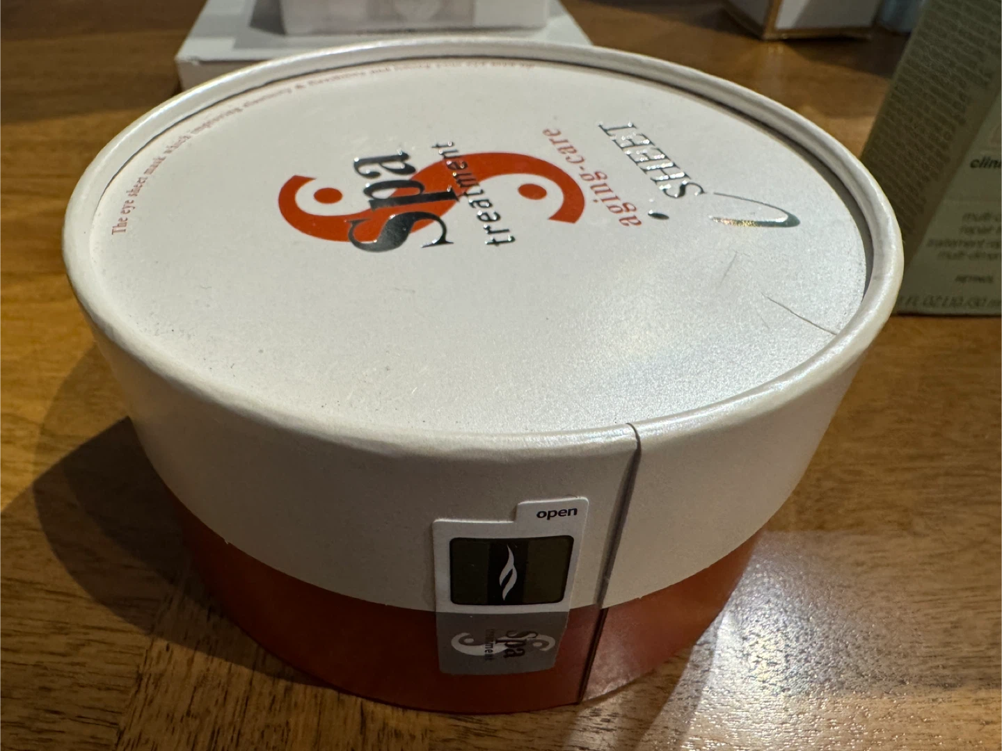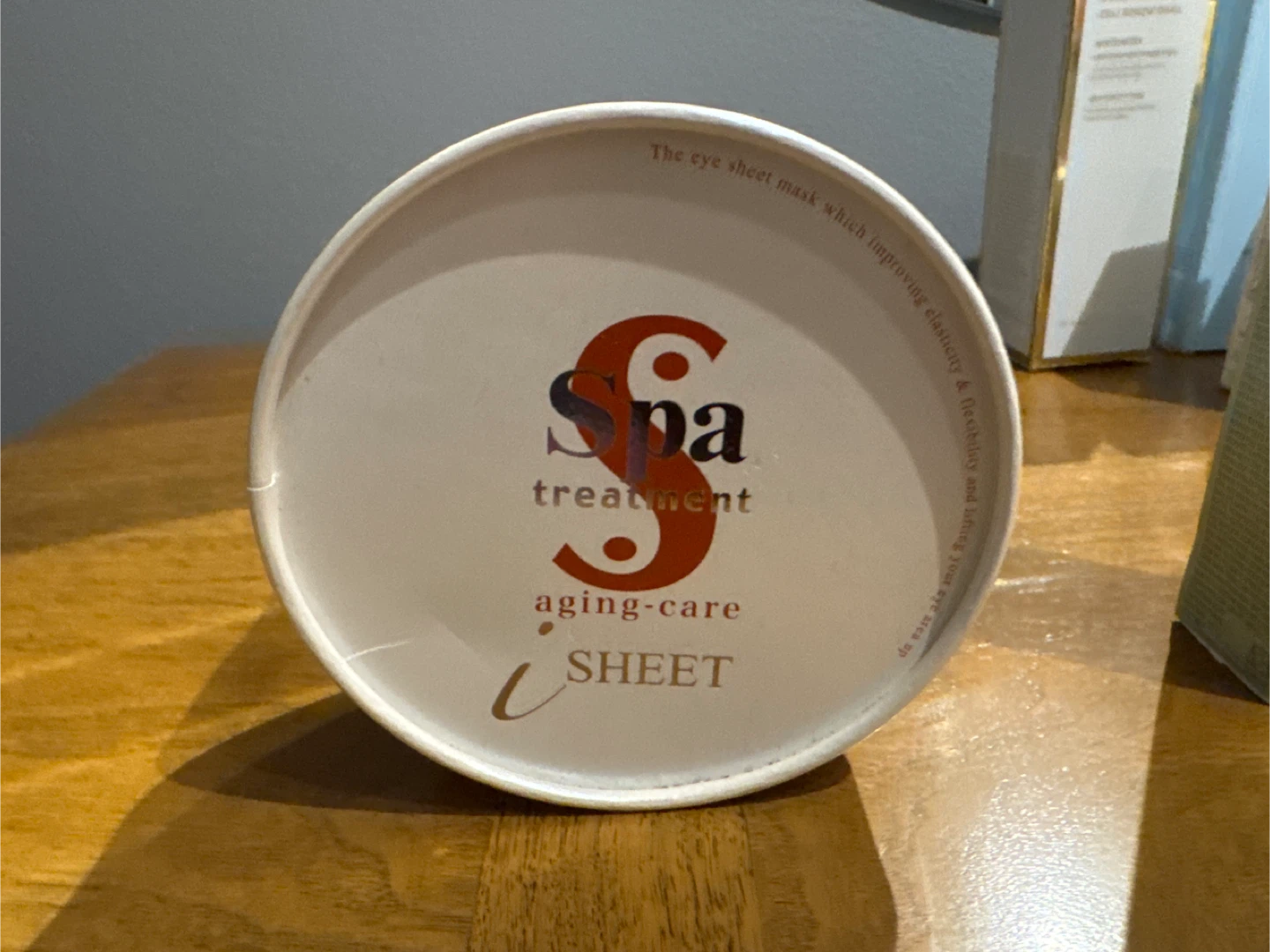 This is a container of Spa Treatment aging-care sheet masks. The eye sheet mask is designed to improve elasticity and flexibility. Great for a refreshing eye treatment!