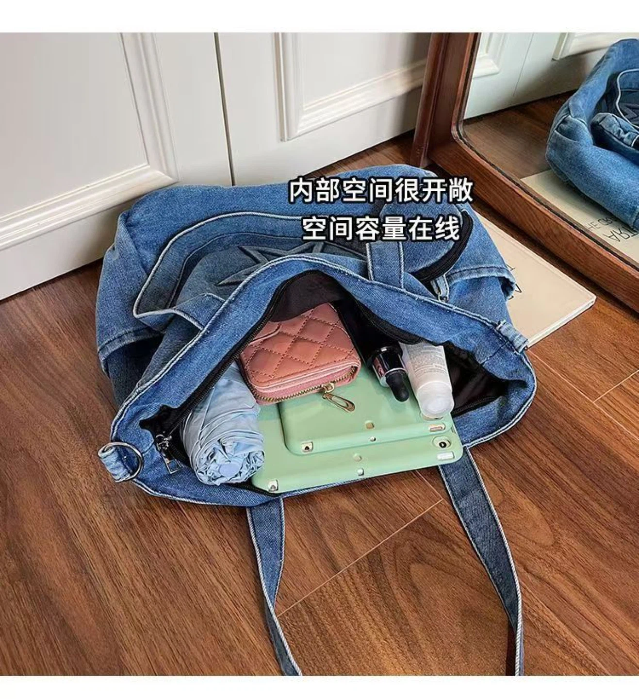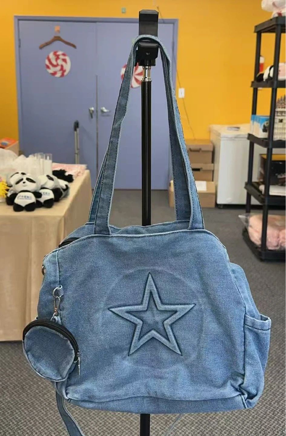 A cool denim tote bag featuring a large star appliqué. It's spacious inside and comes with a matching coin pouch. This bag is great for everyday use, carrying your essentials with a bit of style!