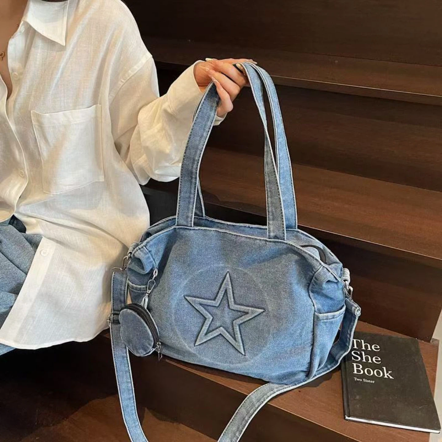 A cool denim tote bag featuring a large star appliqué. It's spacious inside and comes with a matching coin pouch. This bag is great for everyday use, carrying your essentials with a bit of style!