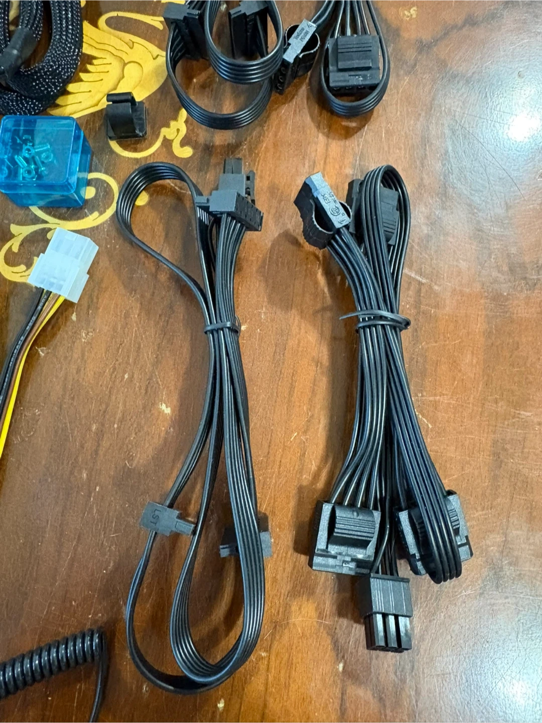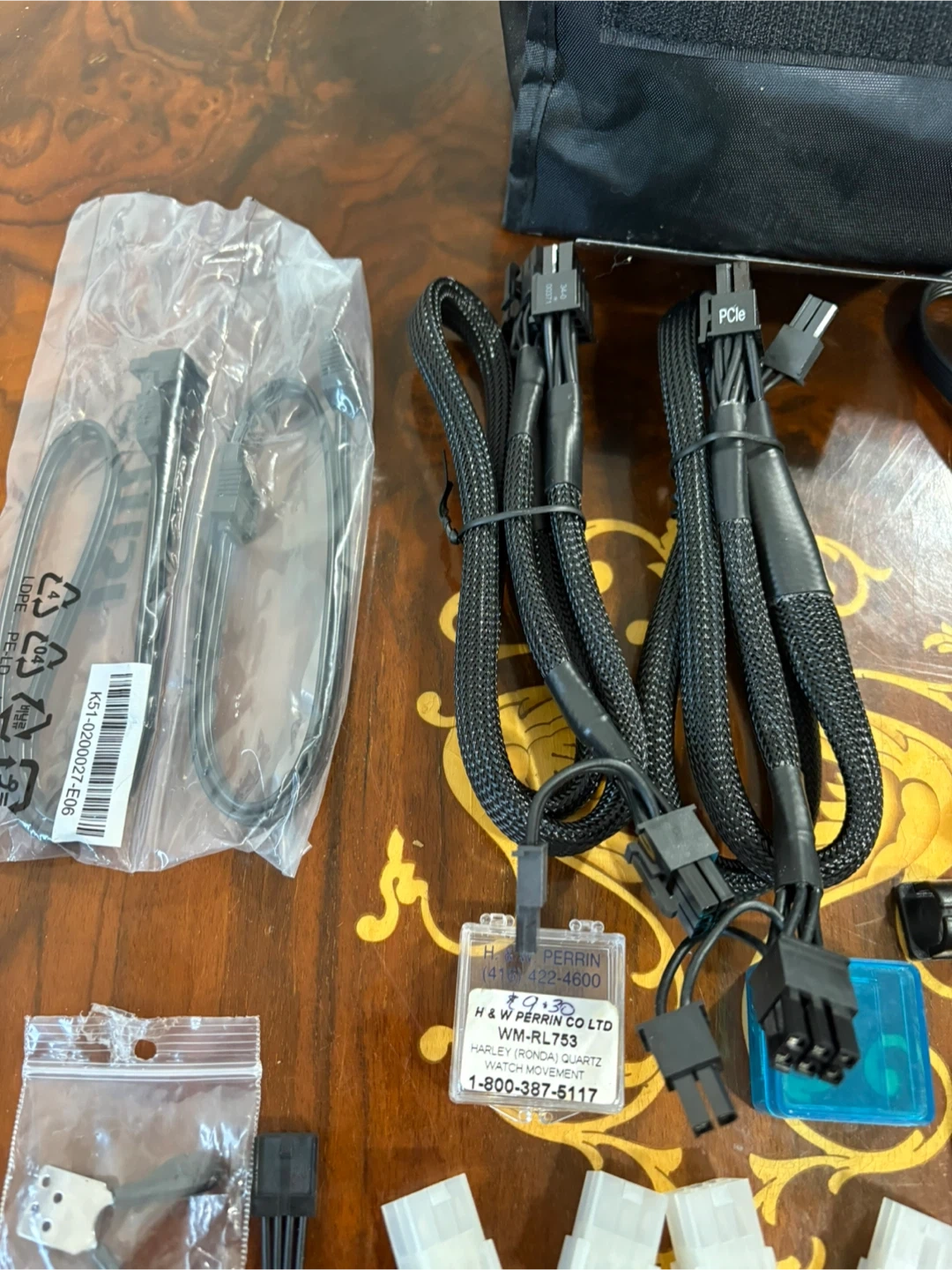 Various power supply cables and mounting hardware for Computer systems. Includes a carrying pouch, assorted modular cables, and screws. All black, with some yellow and white connectors. Some small screws and nuts as well.
