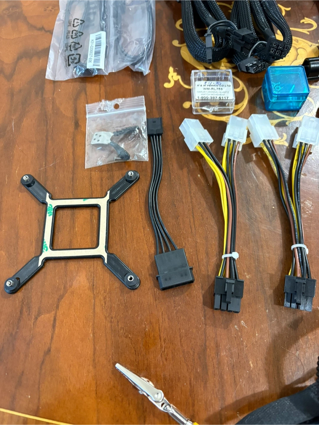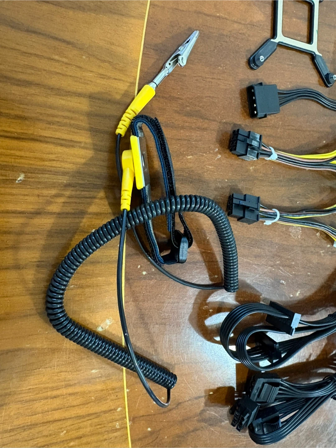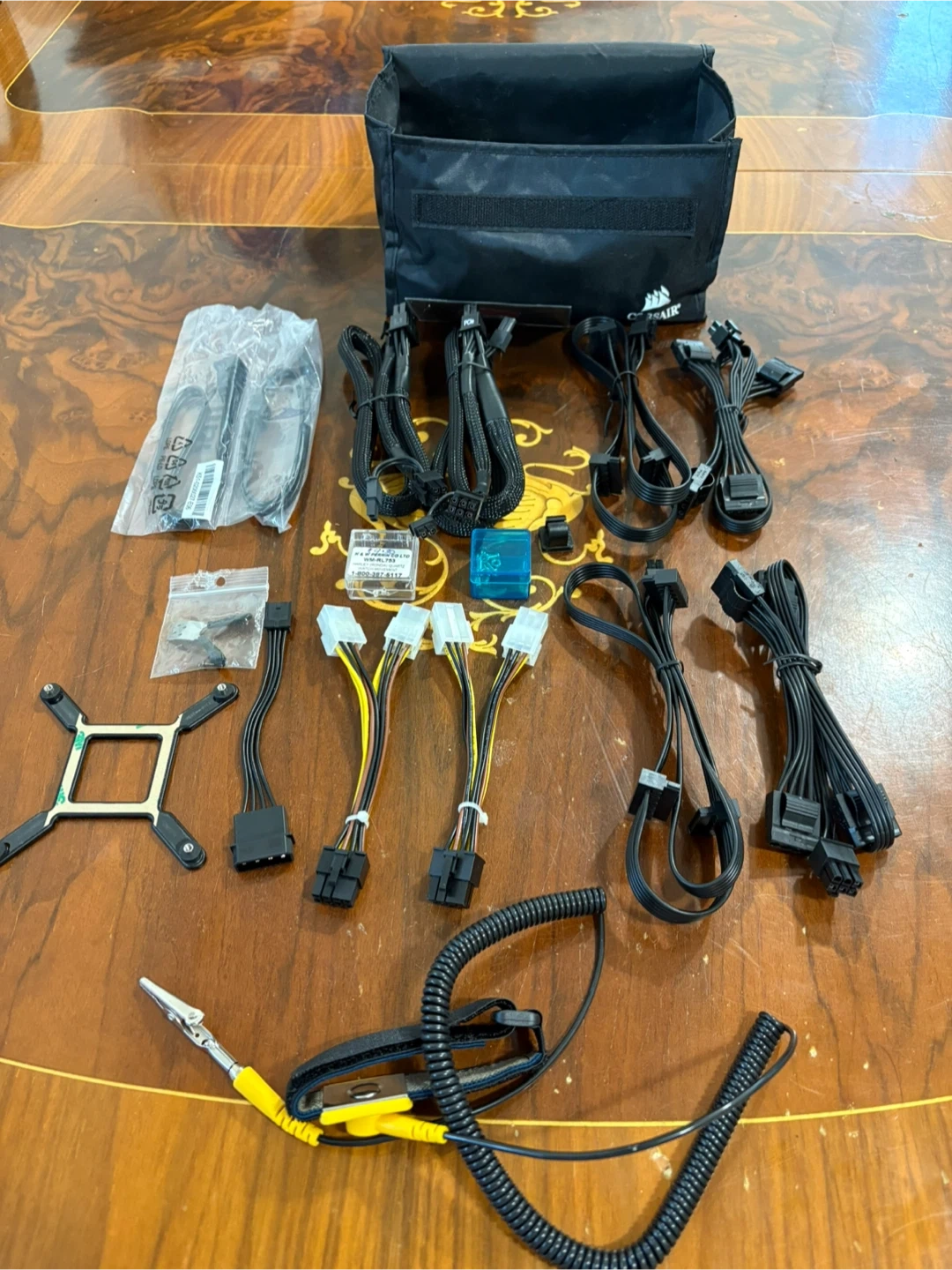 Various power supply cables and mounting hardware for Computer systems. Includes a carrying pouch, assorted modular cables, and screws. All black, with some yellow and white connectors. Some small screws and nuts as well.