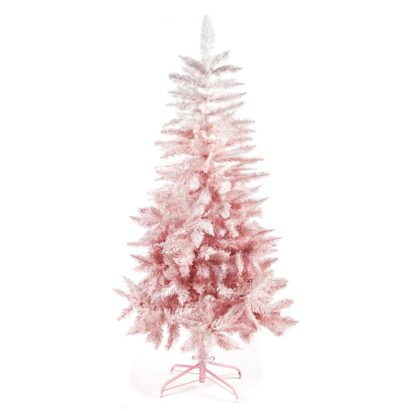 A festive pink ombre tinsel Christmas tree. Features a white-to-pink gradient and a sturdy metal stand. Perfect for adding a pop of colour to your holiday decor!