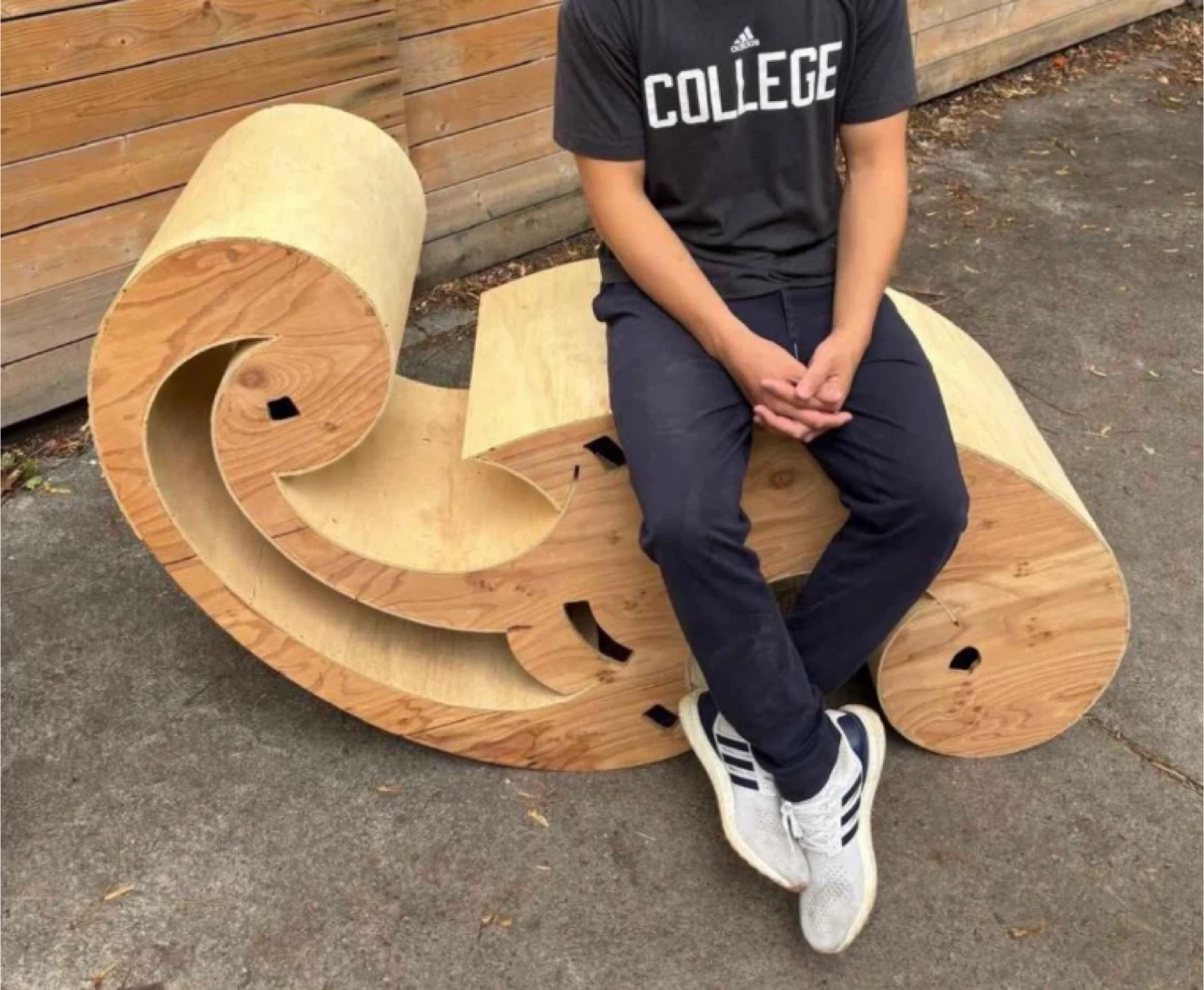 This is a one-of-a-kind sculptural piece made from plywood, fir and balsam. It's a conversation starter and a functional seating option. The layered plywood construction gives it a dynamic, flowing form. It rocks and has a hollow interior if you want to add lights.
