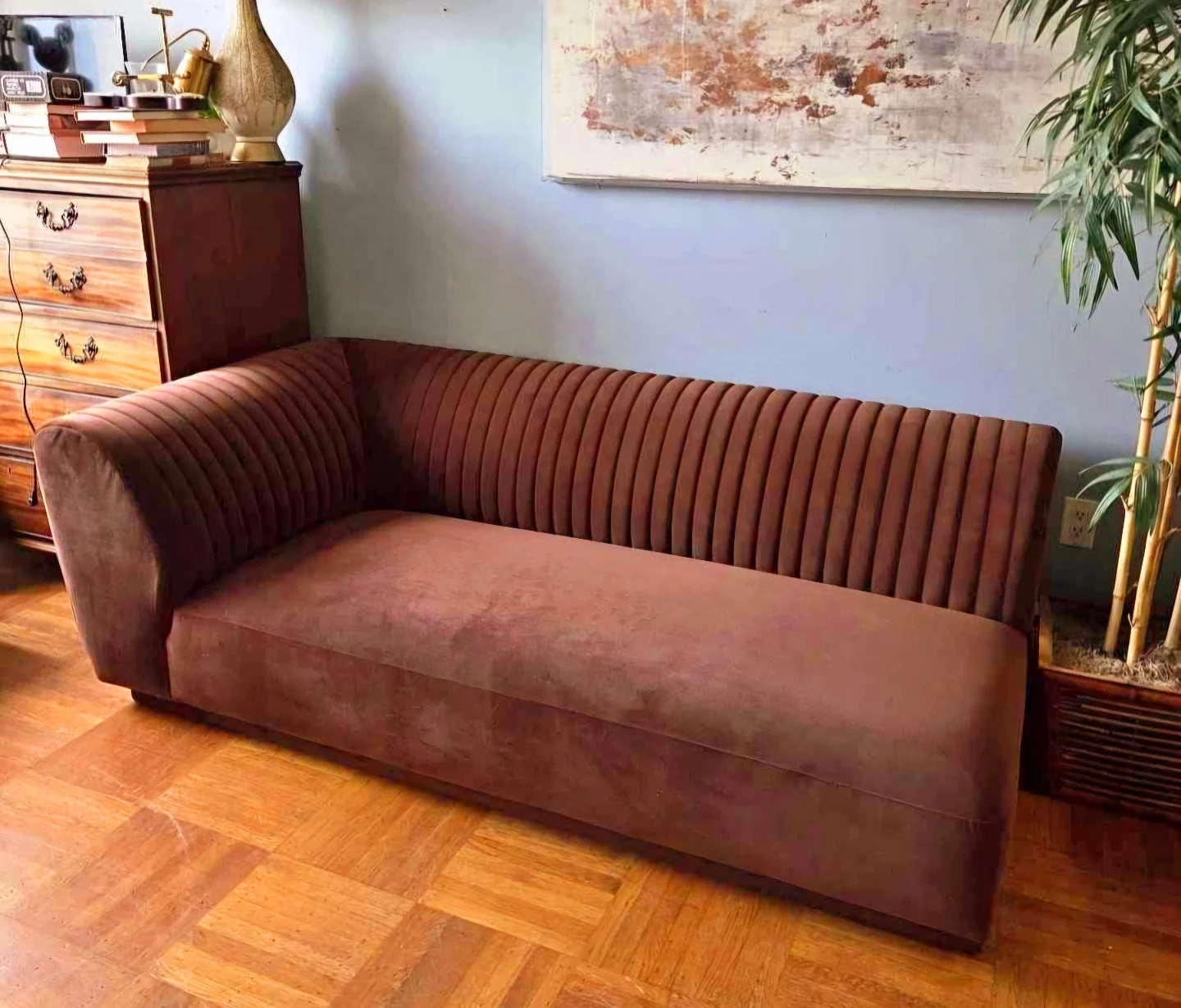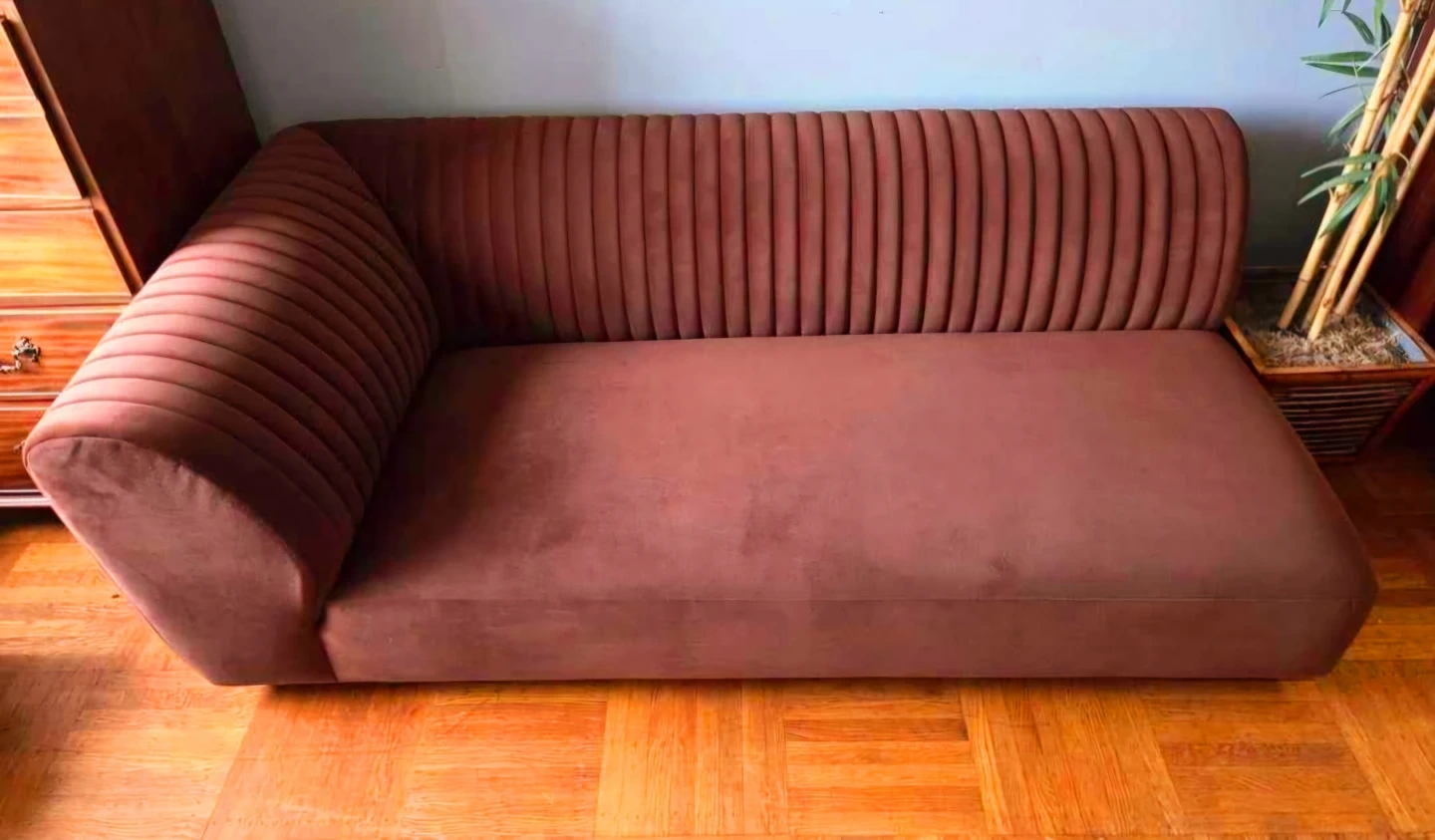 Stunning mid-century modern style brown velvet sofa by Moe's Home Collection.
