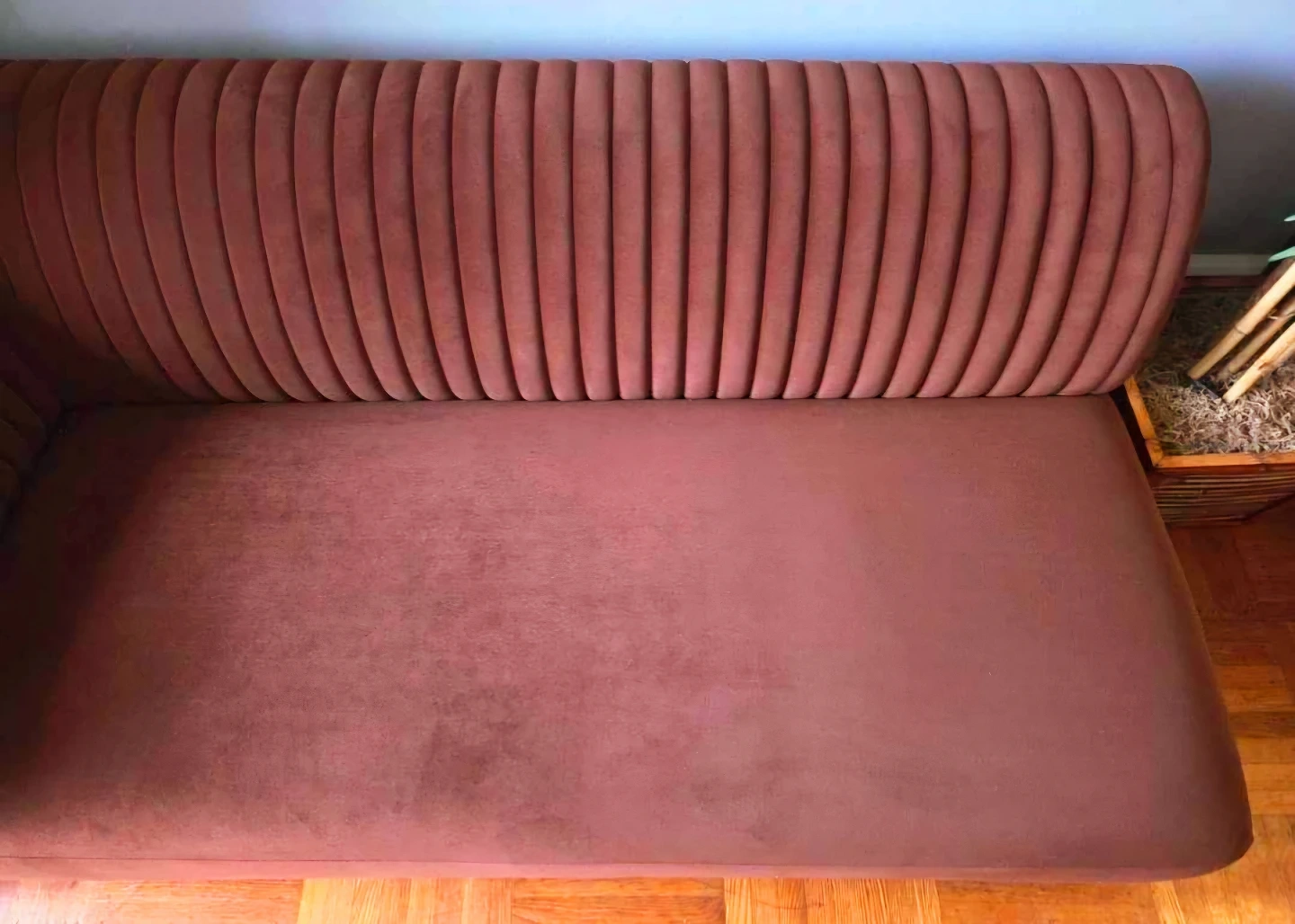 Stunning mid-century modern style brown velvet sofa by Moe's Home Collection.