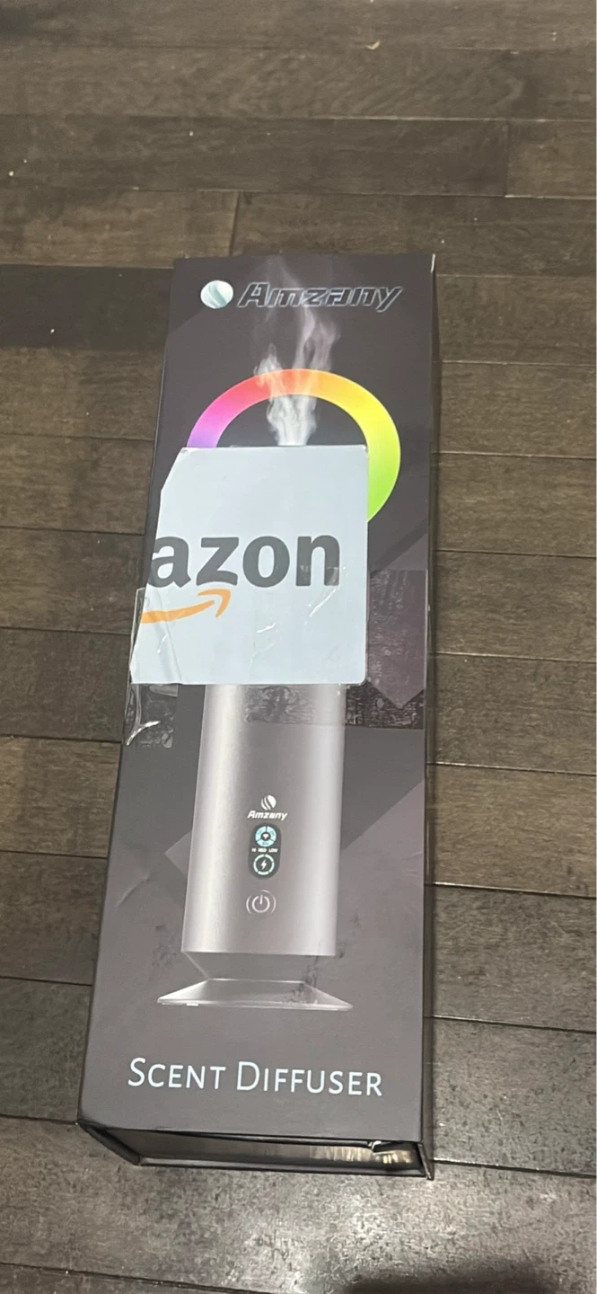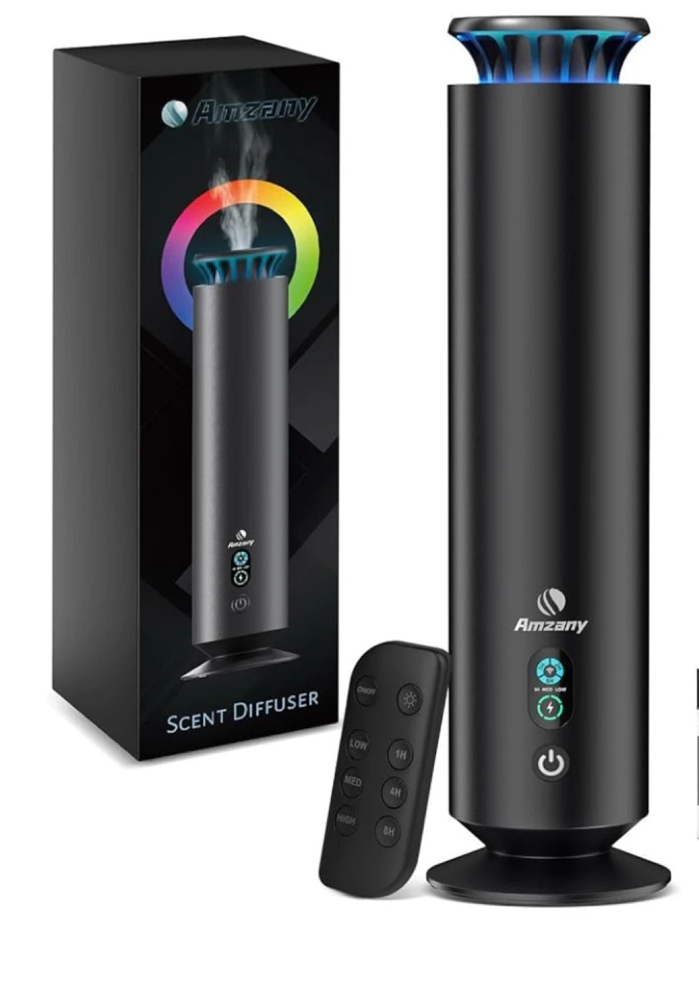 This Amzany scent diffuser comes with a remote control. It's designed to add fragrance to your space. Features include adjustable mist settings and customizable LED lighting. Comes with 3 scent oils.