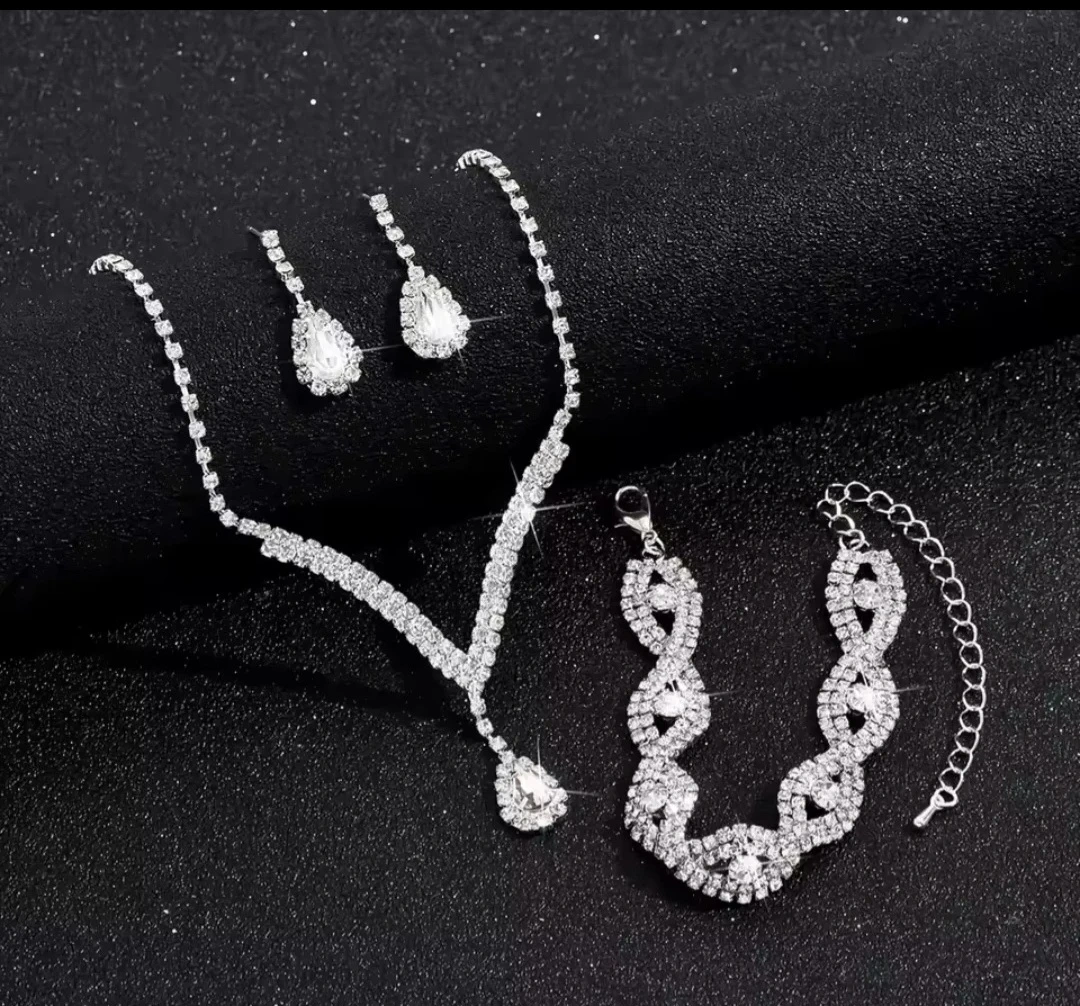 This sparkling jewellery set includes a necklace, a pair of earrings, and a bracelet. It's embellished with rhinestones for a glamorous look. Perfect for special occasions!