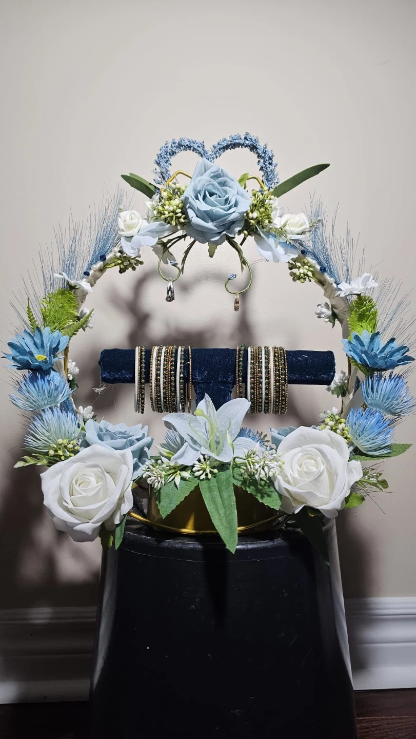This decorative display stand is adorned with artificial blue and white flowers, including roses and lilies. It features a central bar to hold bangles and a heart-shaped top accent. The stand also has hooks for hanging earrings. It's a lovely piece for showcasing jewelry.