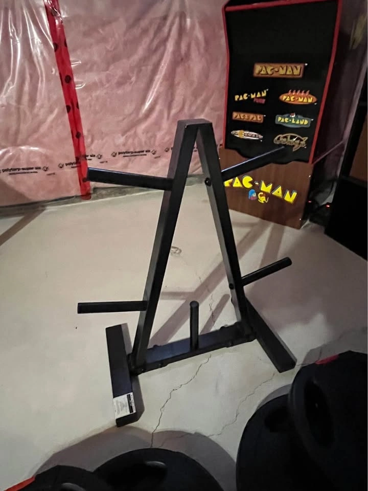 Plates are solid and durable. Bars are in good condition with spin-lock collars. Weight tree keeps everything organized and off the floor.