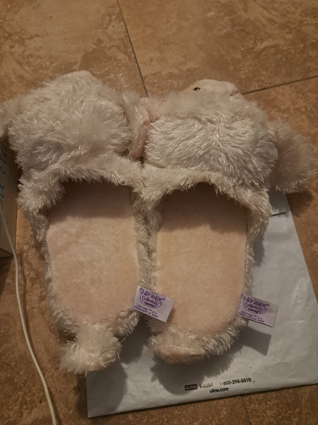 Cute and cozy white fuzzy slippers shaped like little animals. They're soft and have grippy soles for traction. Perfect for keeping your feet warm around the house!