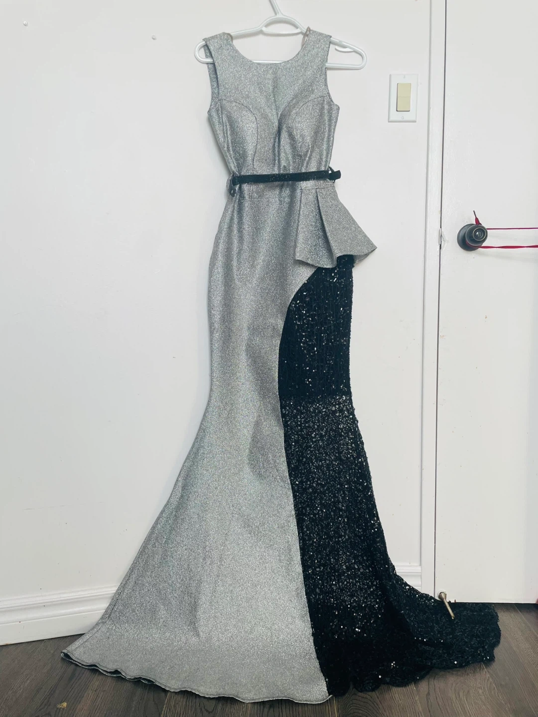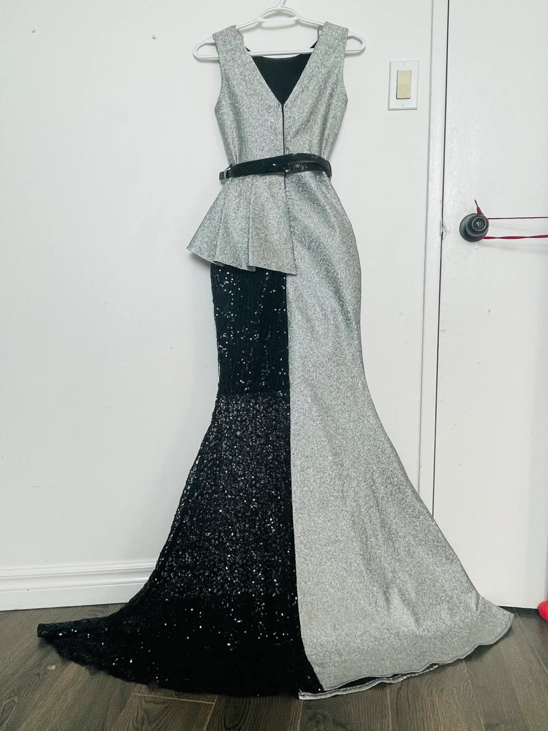 This sparkly formal gown features a silver glitter top with a black sequined mermaid skirt. It has a flattering silhouette and a V-neckline. Perfect for a special occasion! Turkish brand