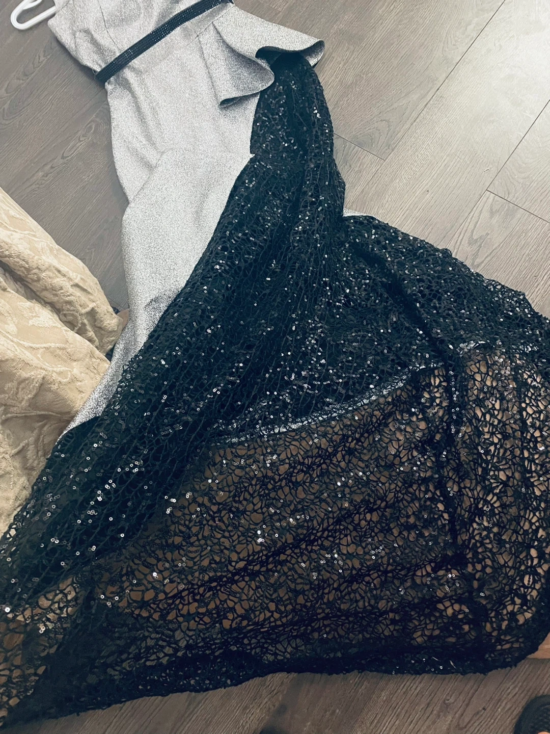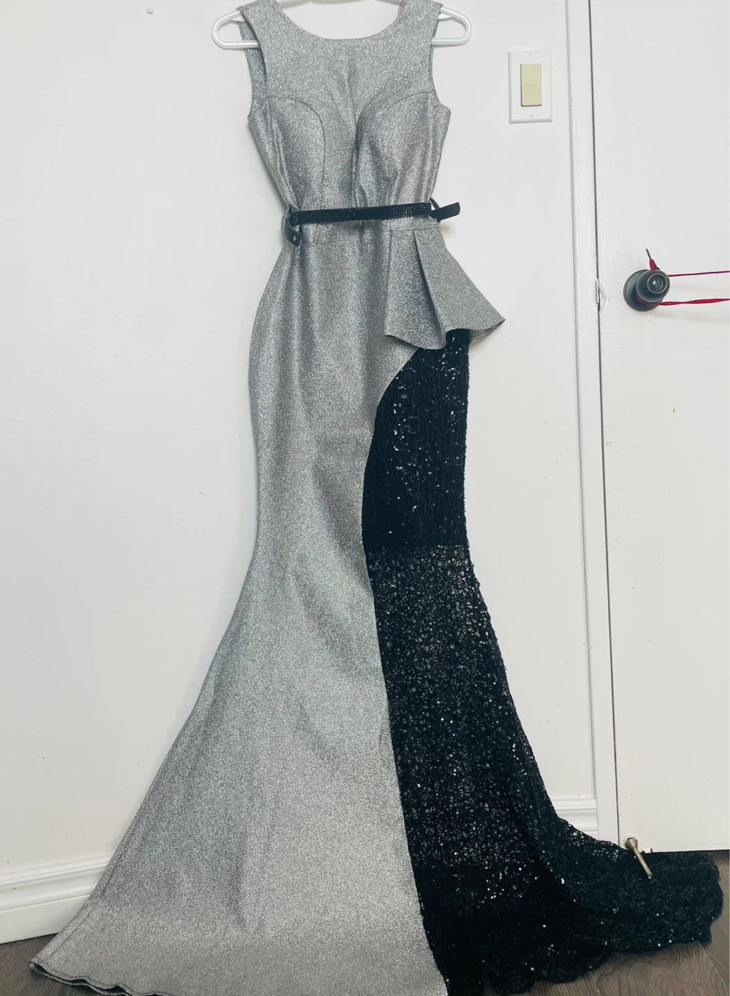 This sparkly formal gown features a silver glitter top with a black sequined mermaid skirt. It has a flattering silhouette and a V-neckline. Perfect for a special occasion! Turkish brand