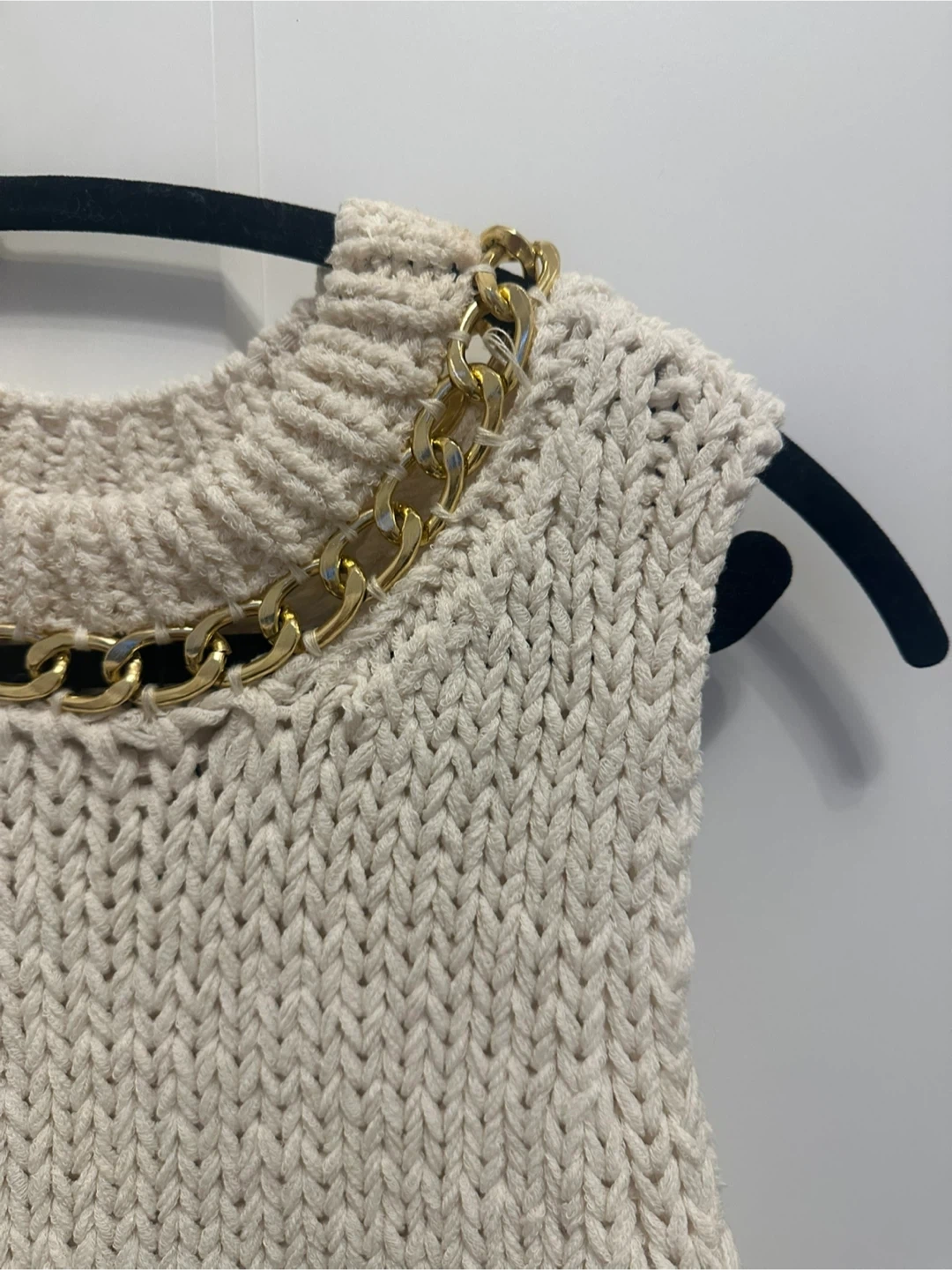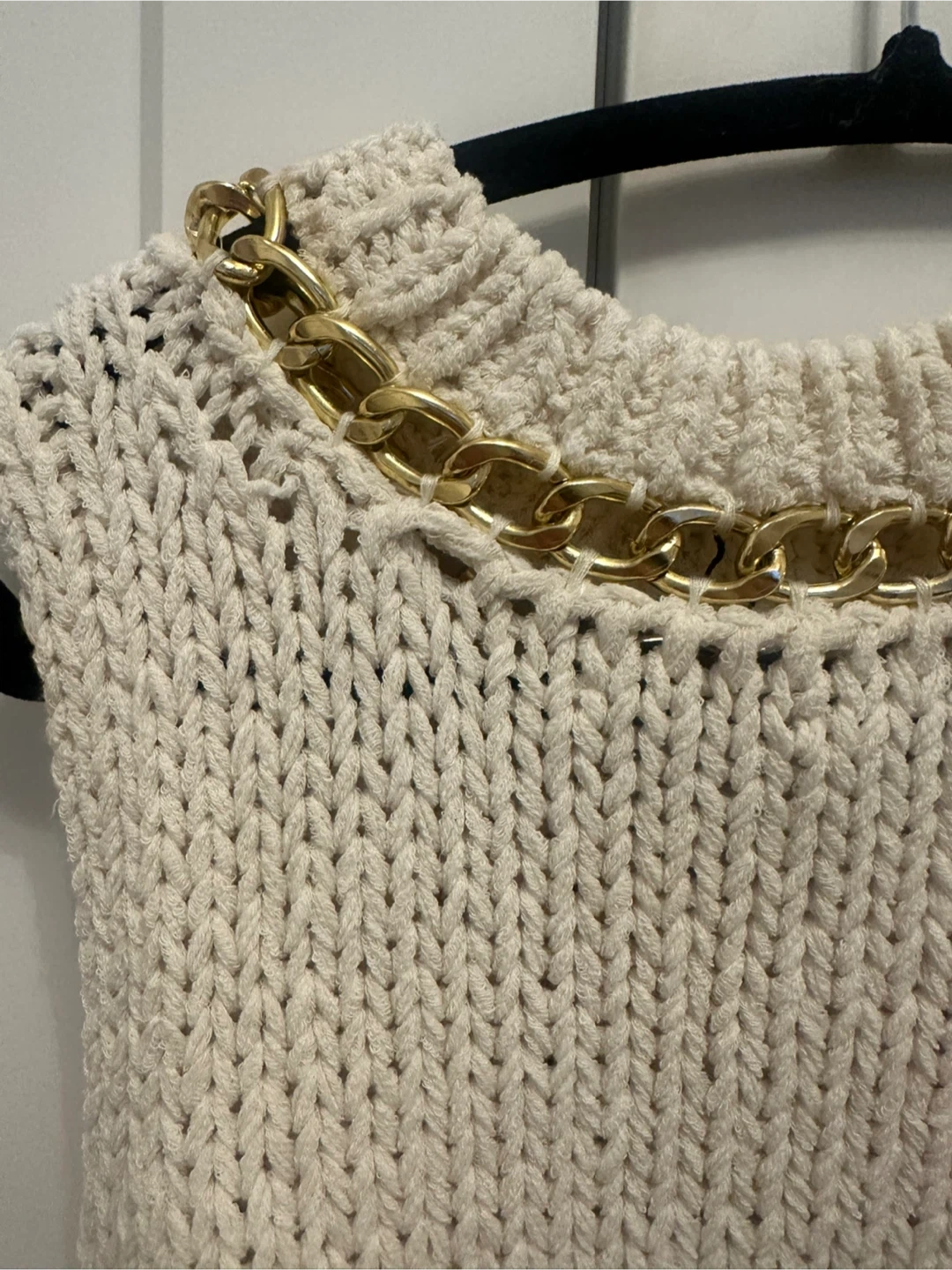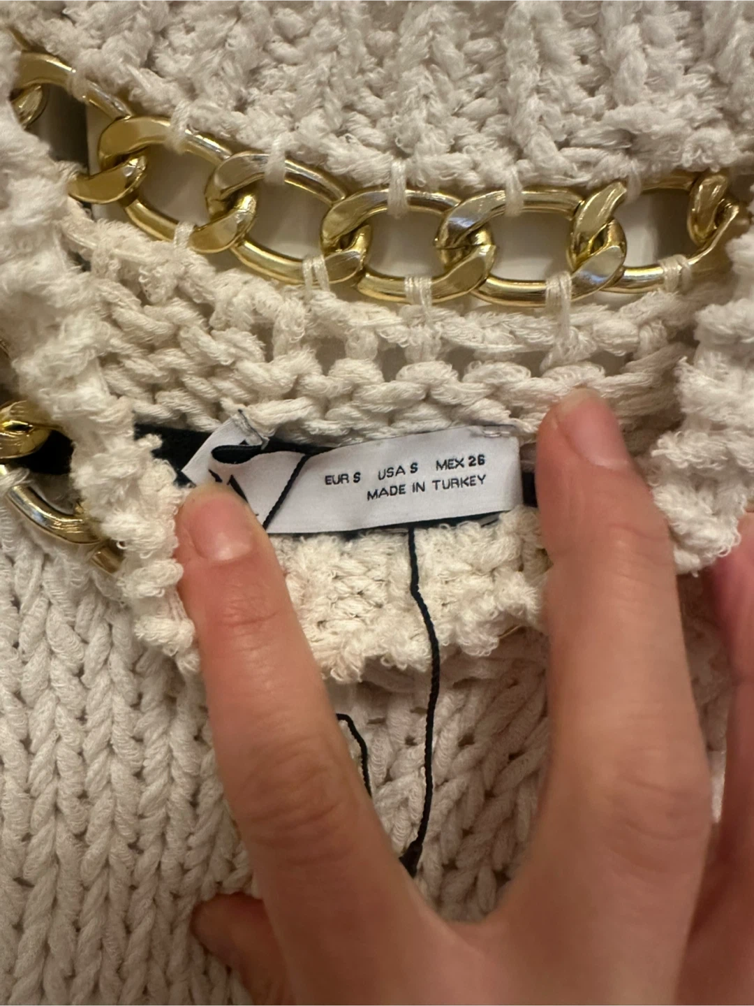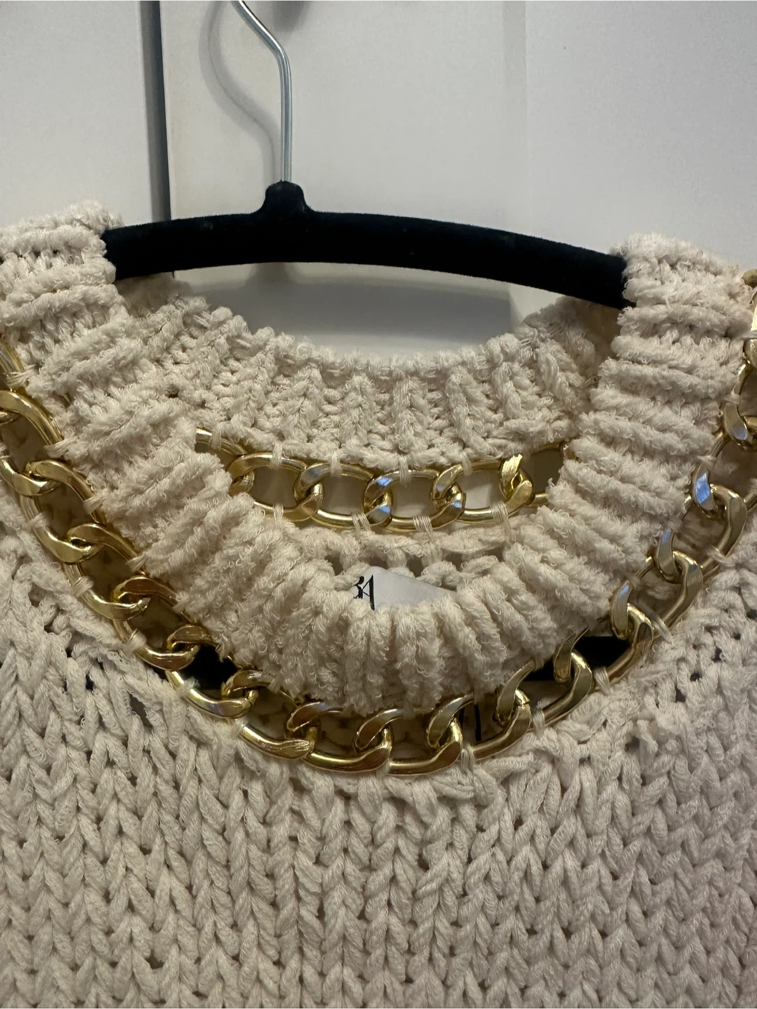 Selling a Zara knit top with a gold chain detail! It's a size small and in great condition. The material is a soft knit, perfect for layering or wearing on its own. It's a stylish piece that adds a touch of elegance to any outfit