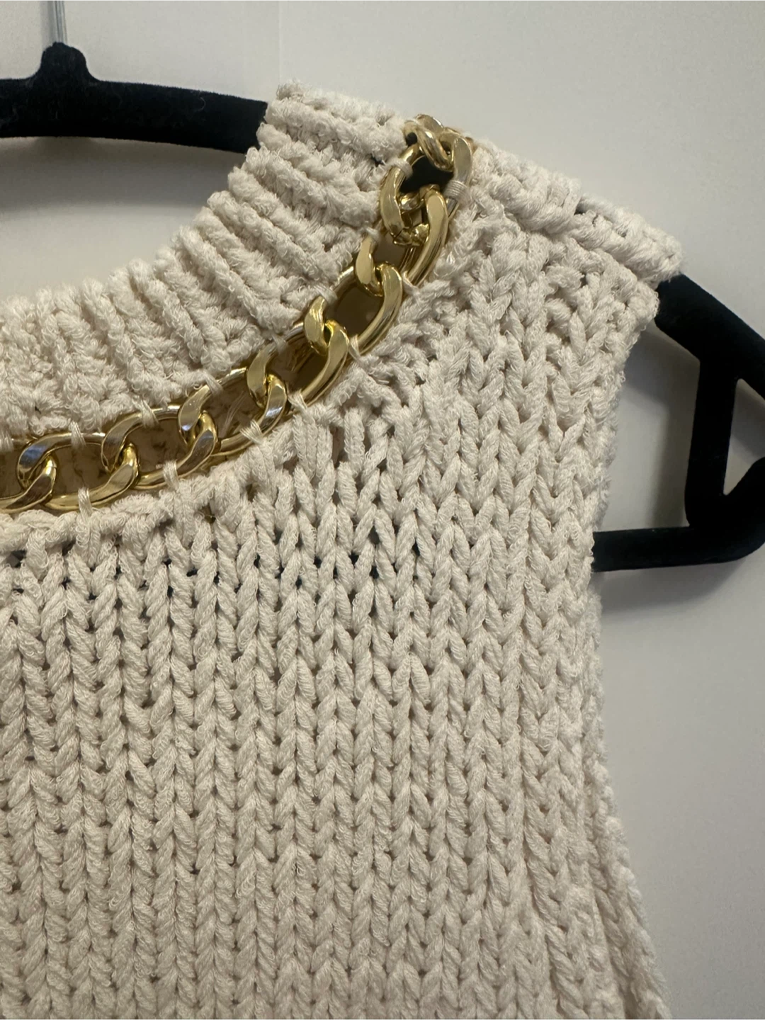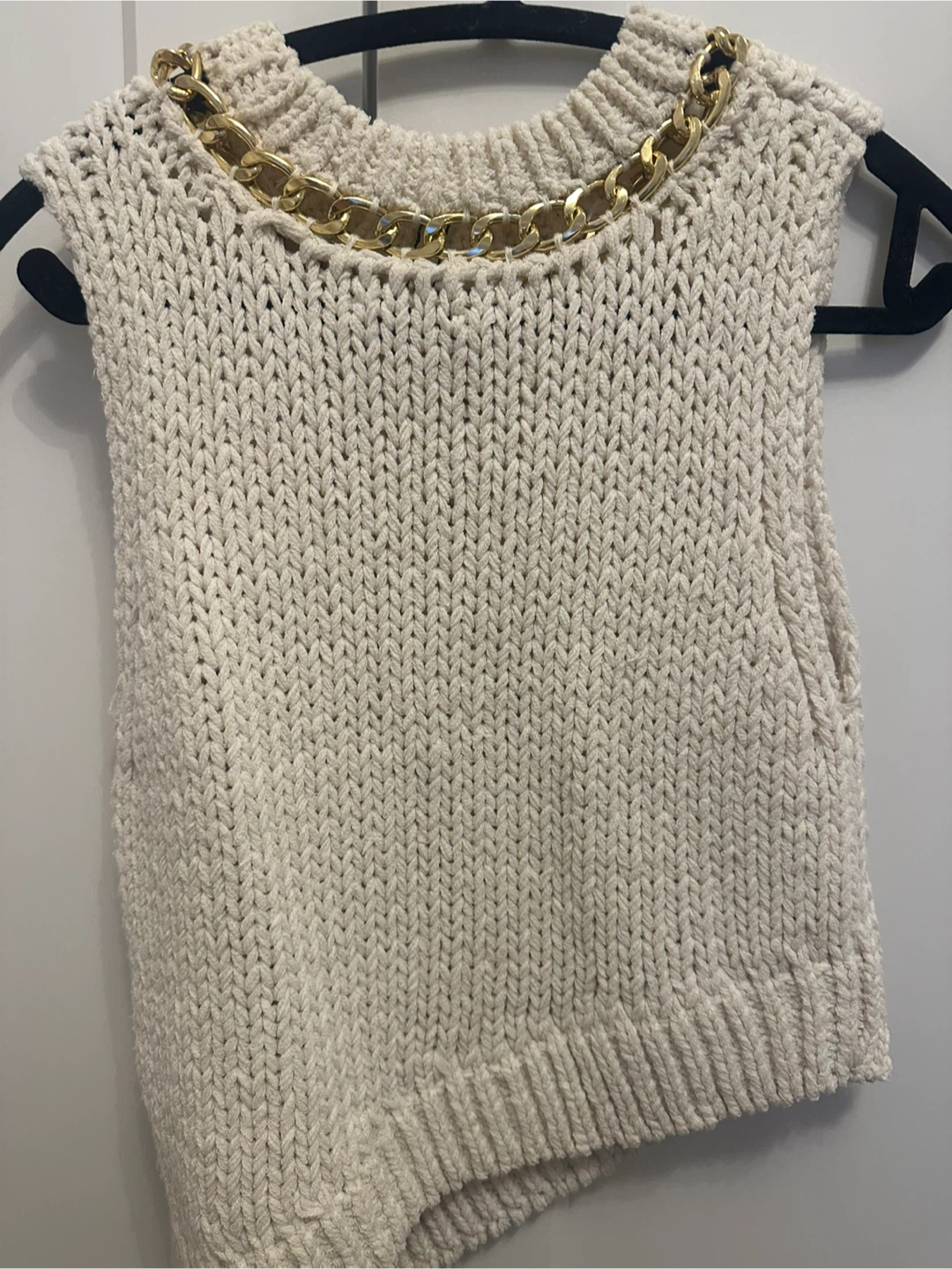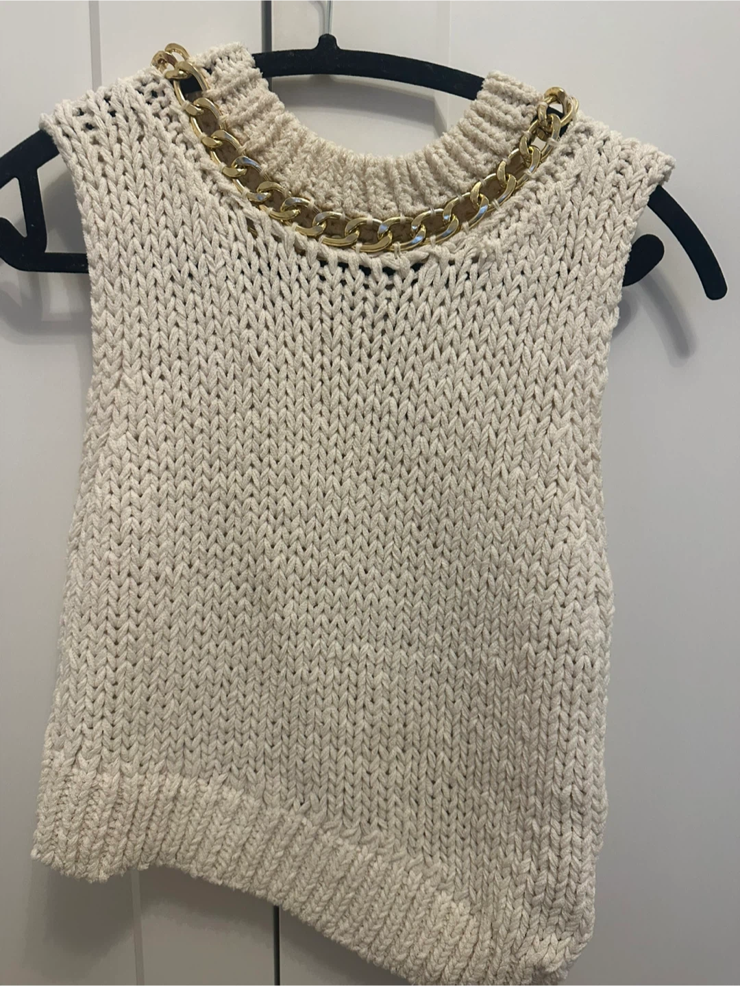 Selling a Zara knit top with a gold chain detail! It's a size small and in great condition. The material is a soft knit, perfect for layering or wearing on its own. It's a stylish piece that adds a touch of elegance to any outfit
