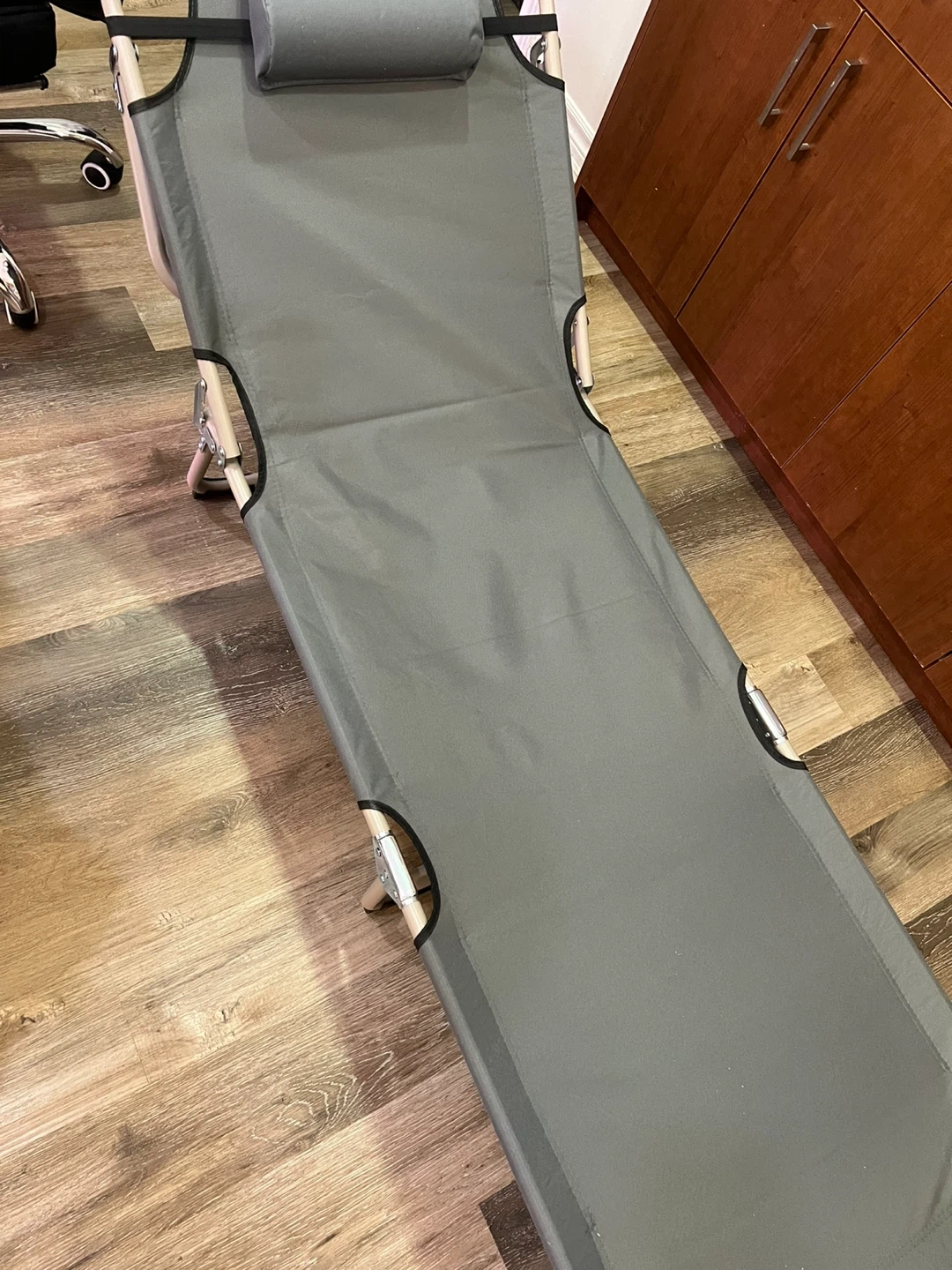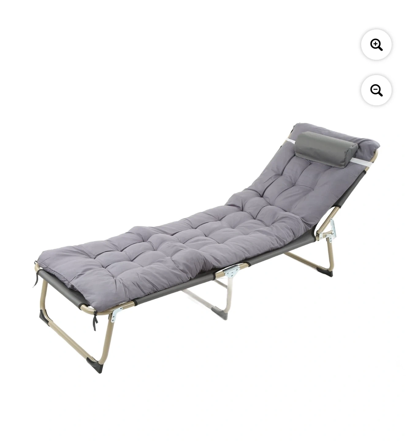 This is a grey folding cot with a removable pillow and a grey cushion. It's made of durable fabric and a metal frame, and it folds up for easy storage. It comes with a carrying bag.