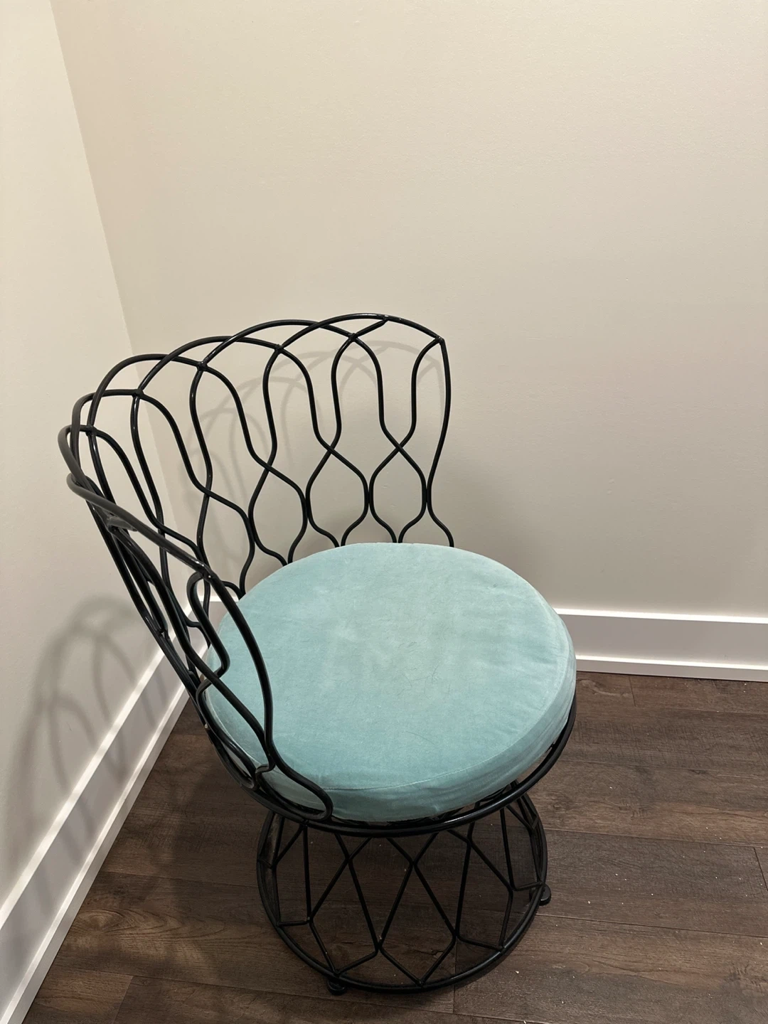 Black metal chair with light blue cushion