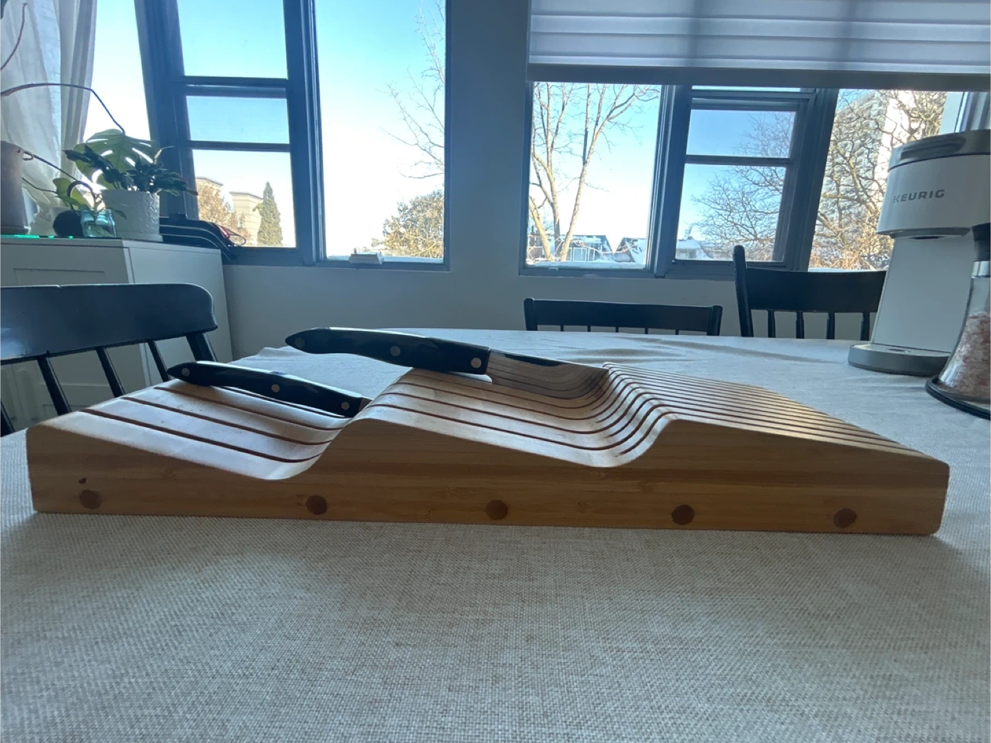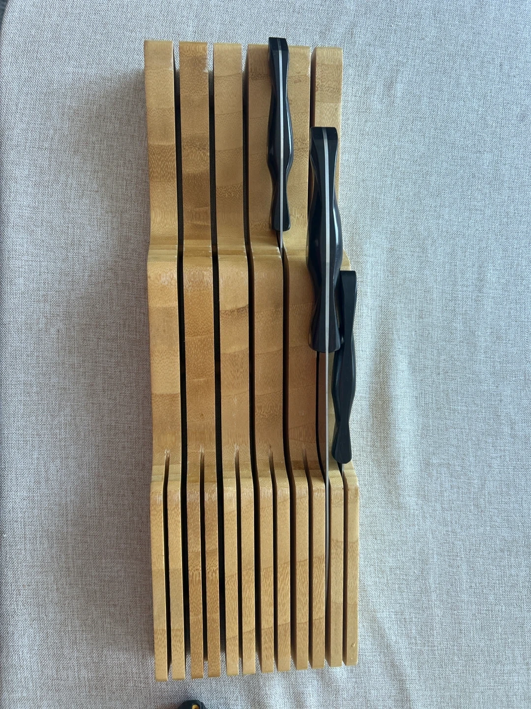 This kitchen drawer knife block is made from durable bamboo. It has multiple slots to safely store your knives. Keep your cutlery organized and accessible!