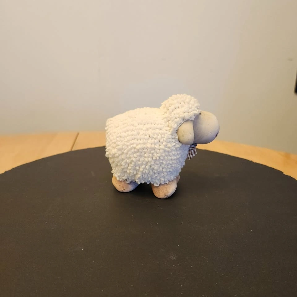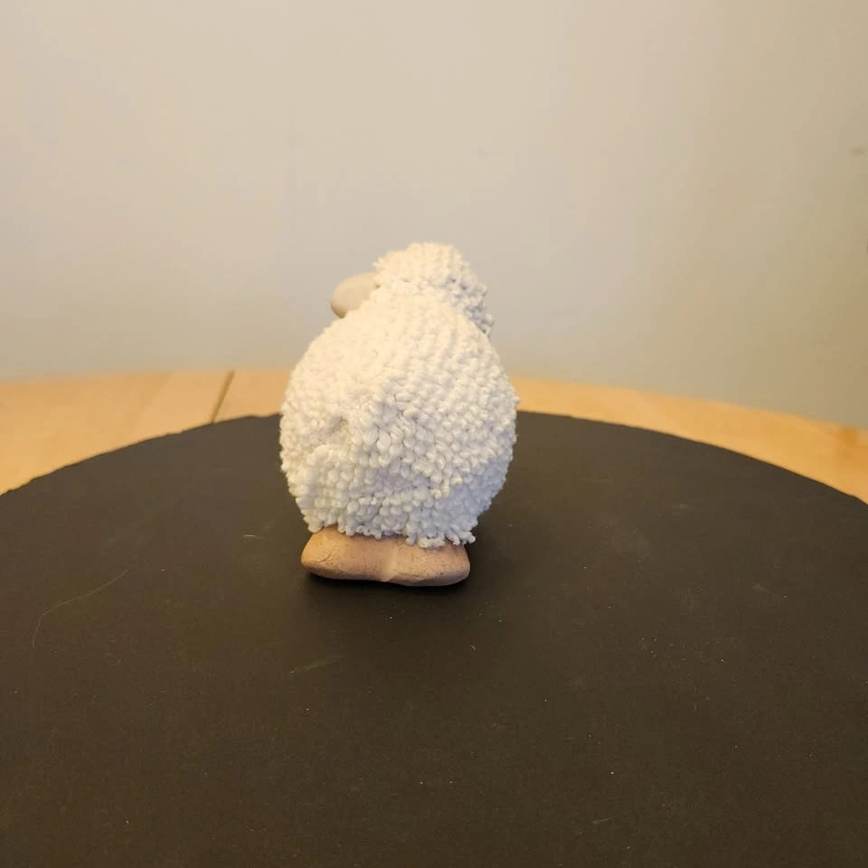 He's made out of ceramic and has a soft textured loop material over his body for the wool.
