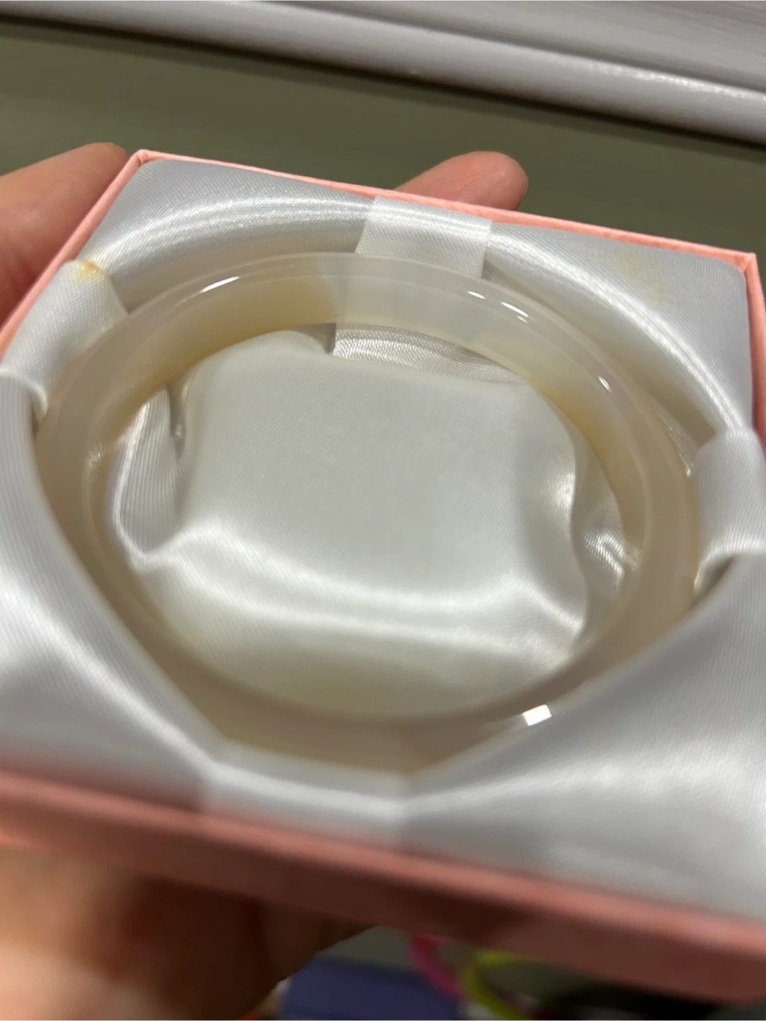 Beautiful white jadeite bangle bracelet. Translucent with subtle yellowish hues. Comes in a pink gift box with satin lining. Crafted from polished jade.