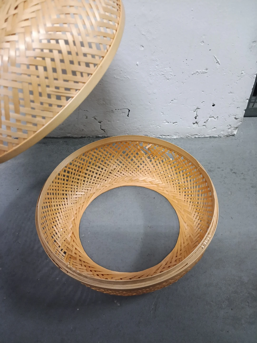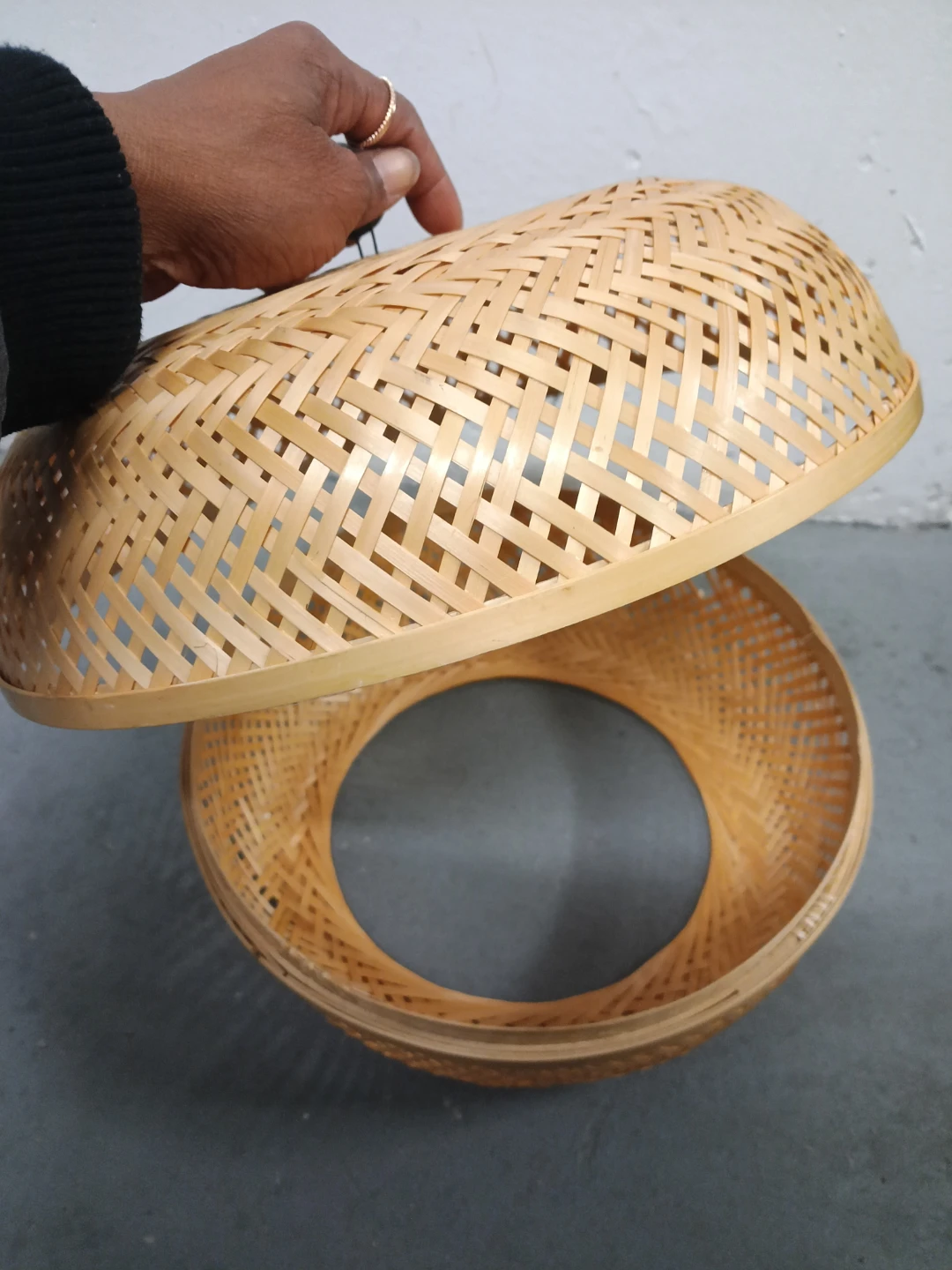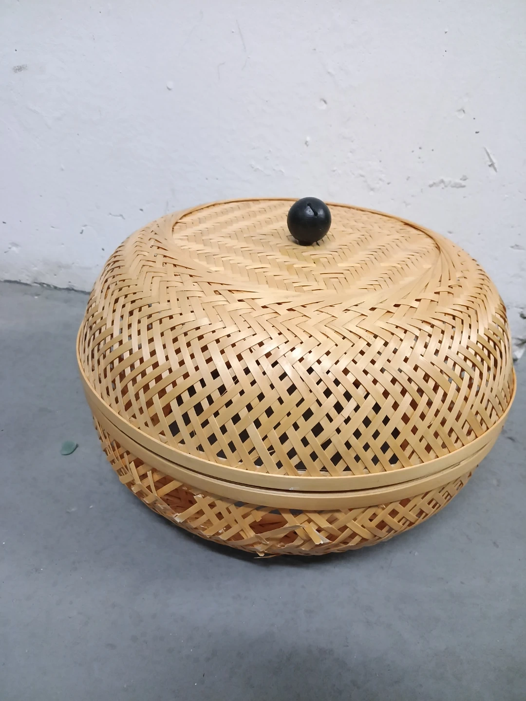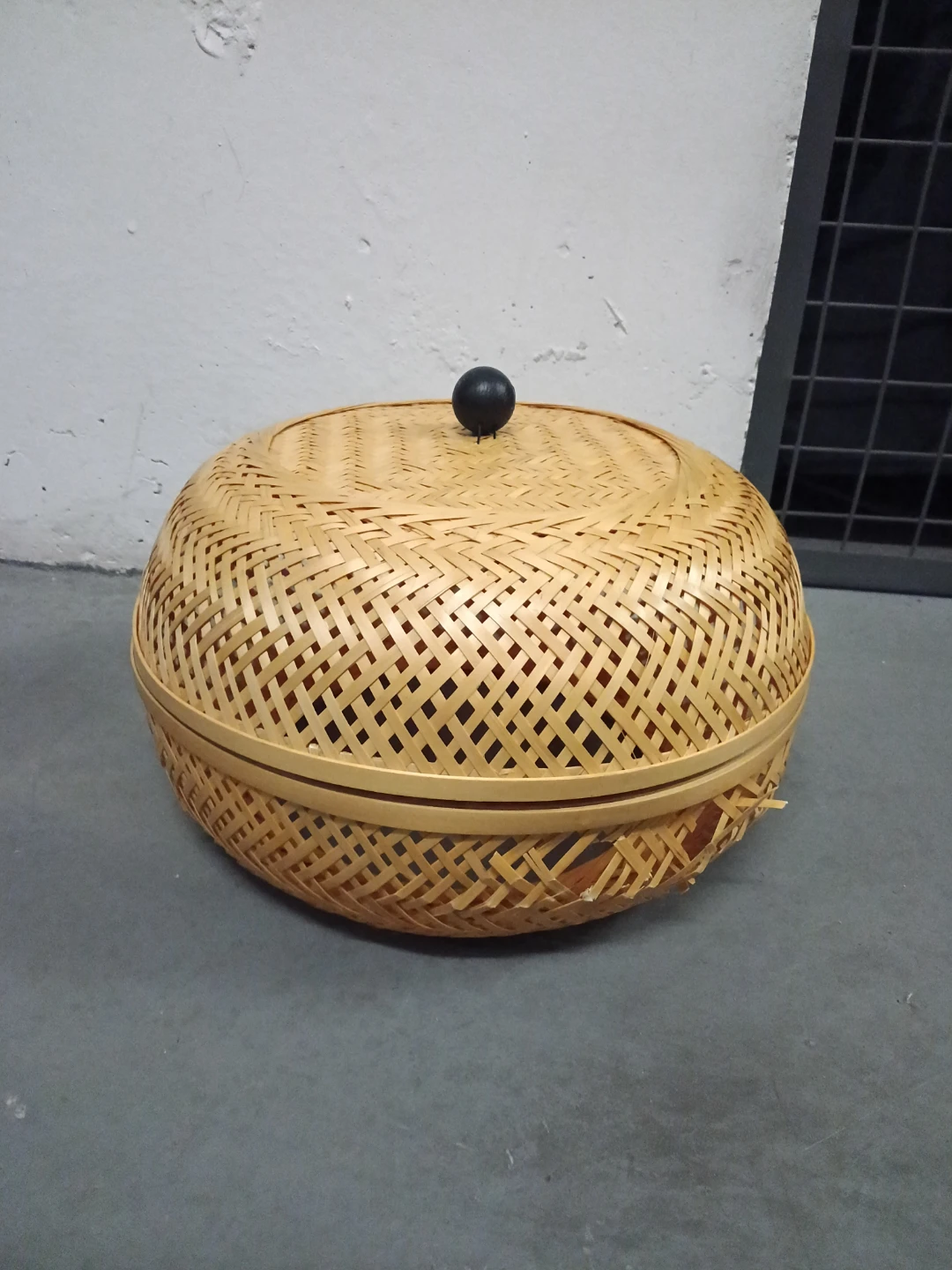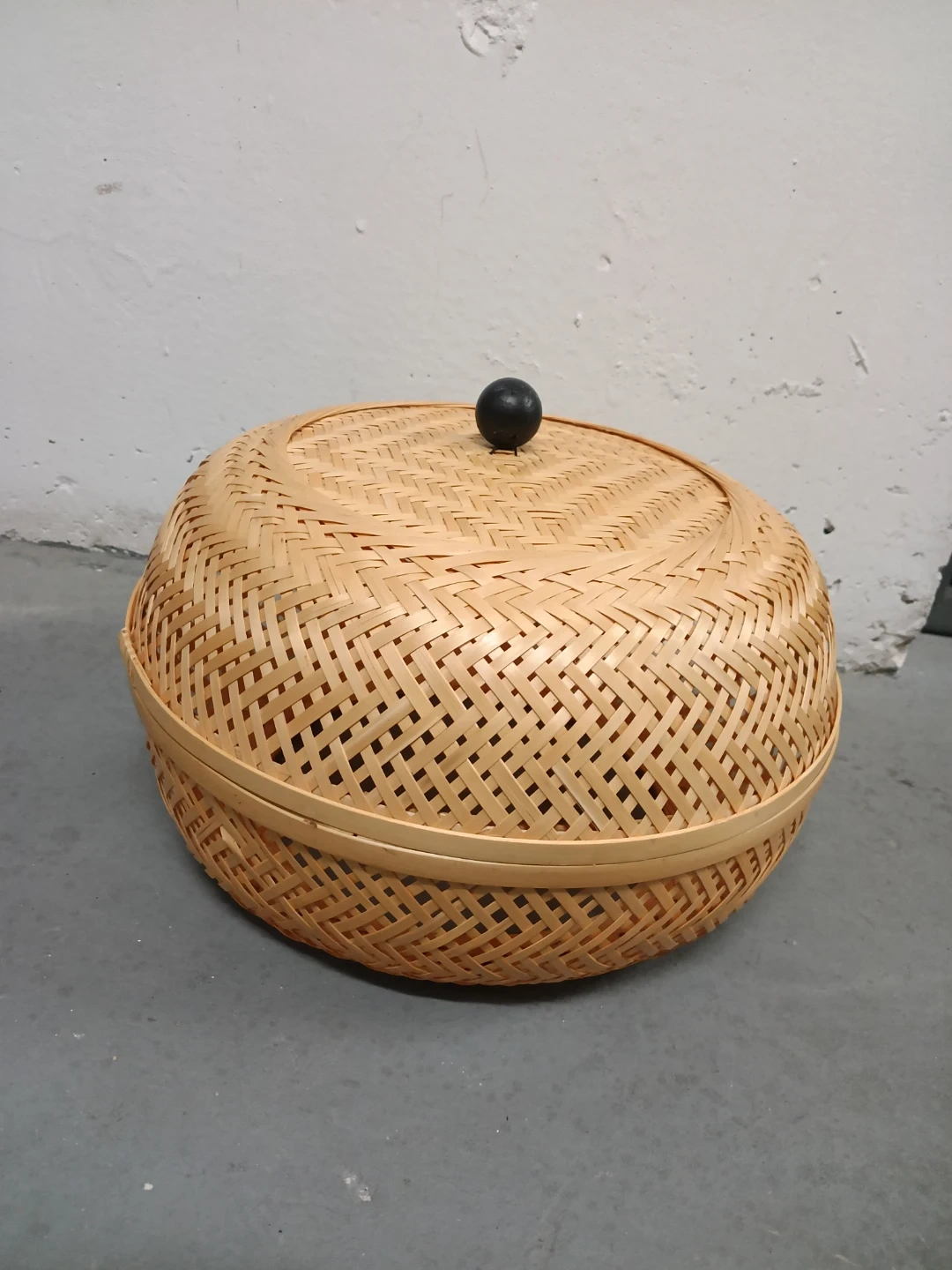 This is a woven bamboo basket with a lid. It's perfect for storing various items. The woven design adds a nice touch to any room.