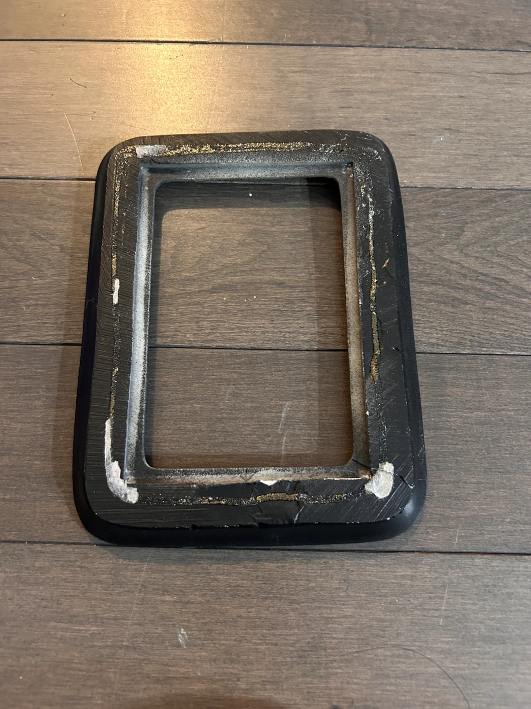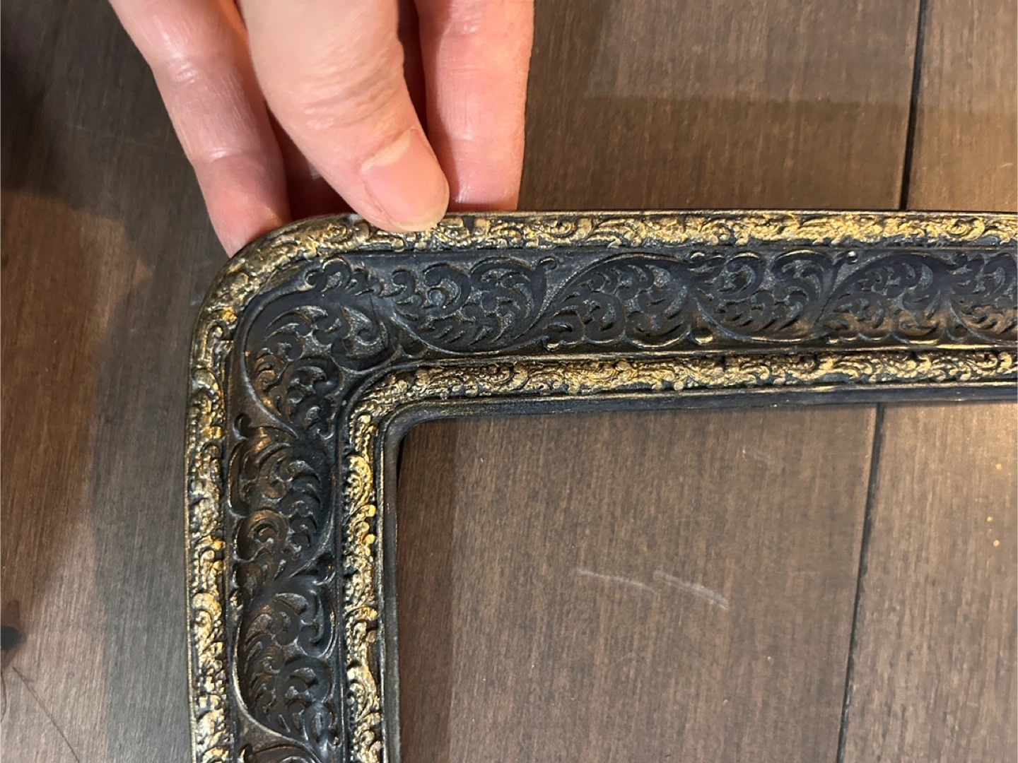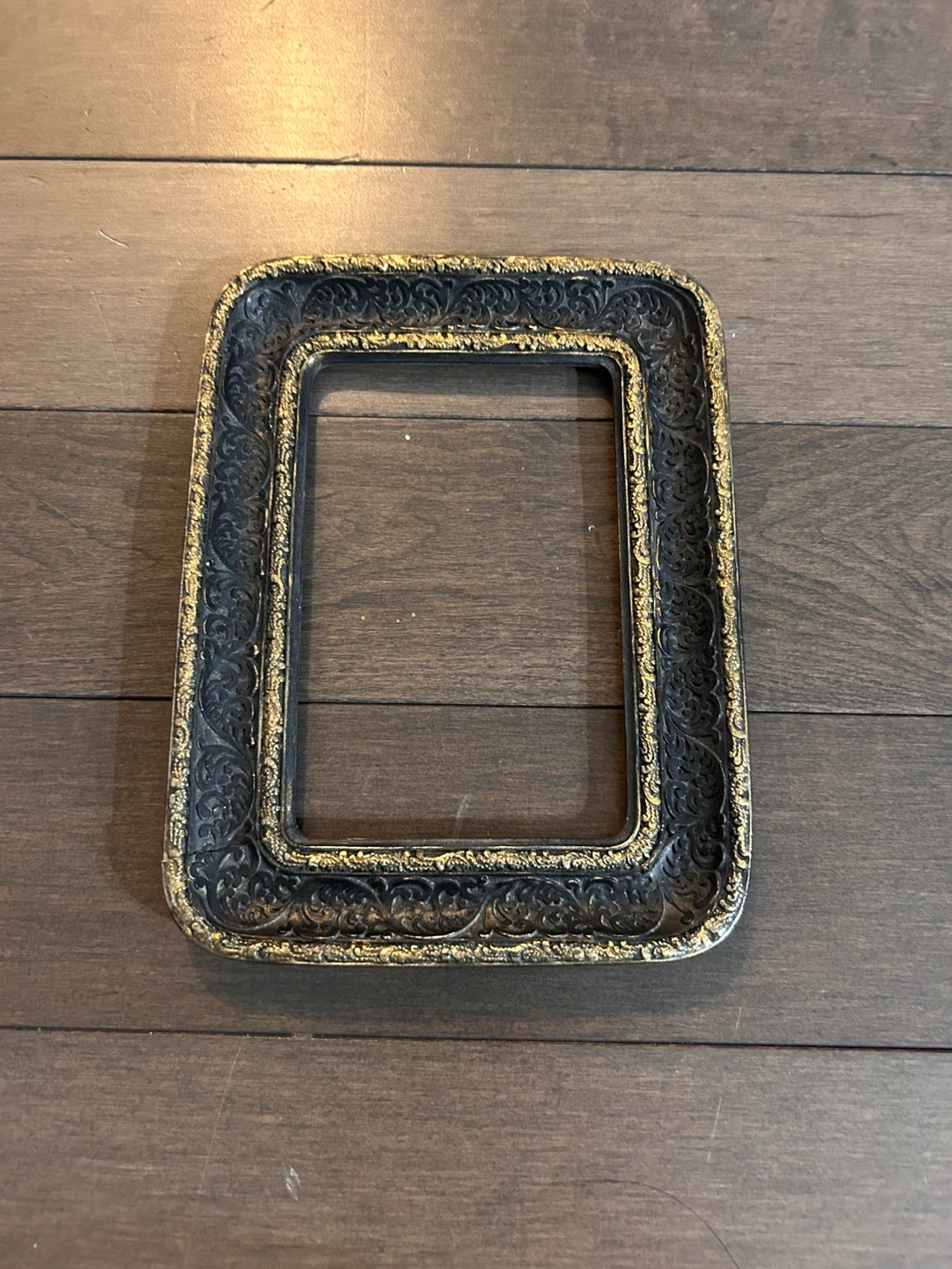 Selling a decorative picture frame with a black and gold finish. It has an ornate design around the edges. Has invisible crack. Perfect for displaying your favourite memories!