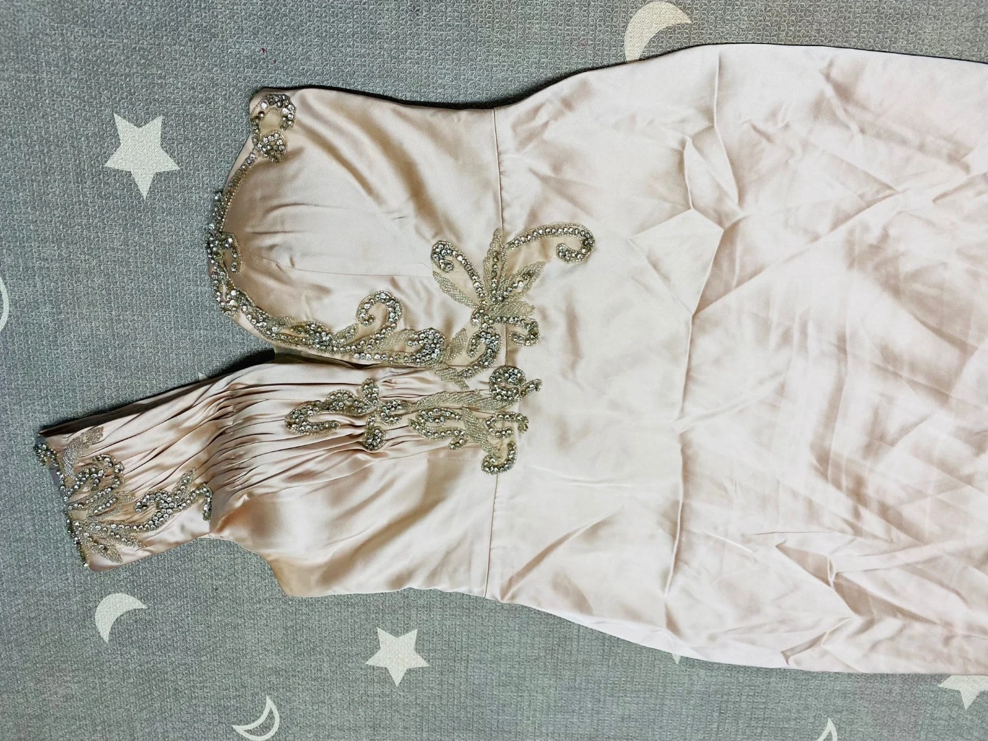 This light pink satin dress features elegant beadwork on the bodice and sleeve. It has a flattering silhouette with delicate ruching details. Perfect for formal events or parties!