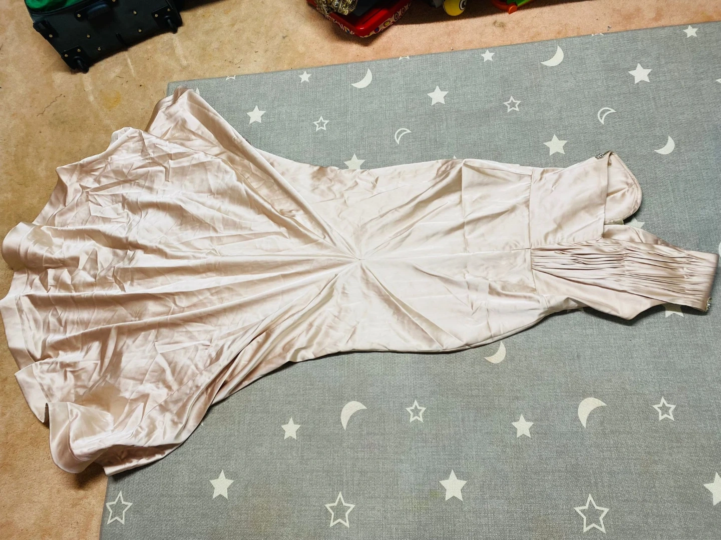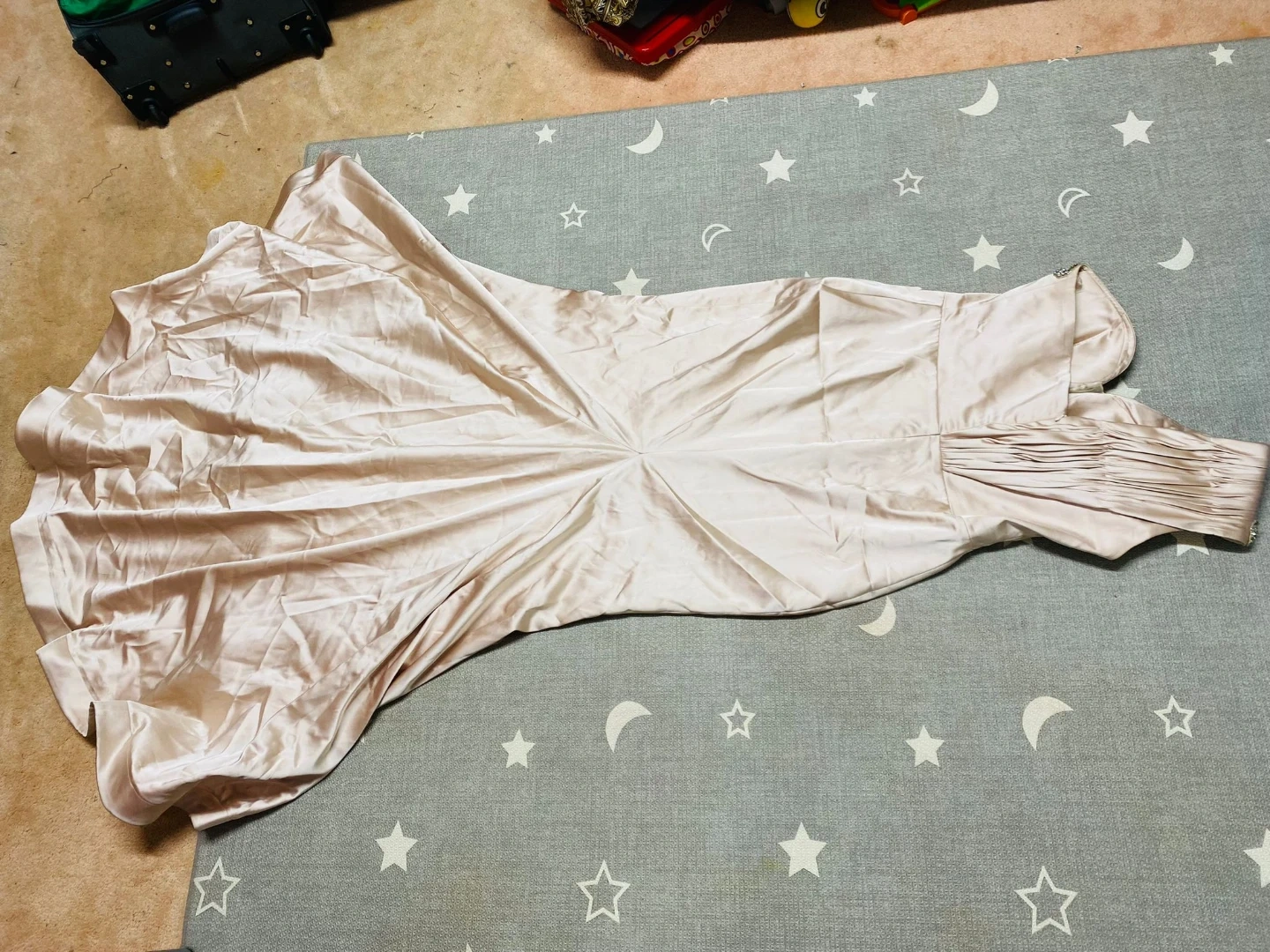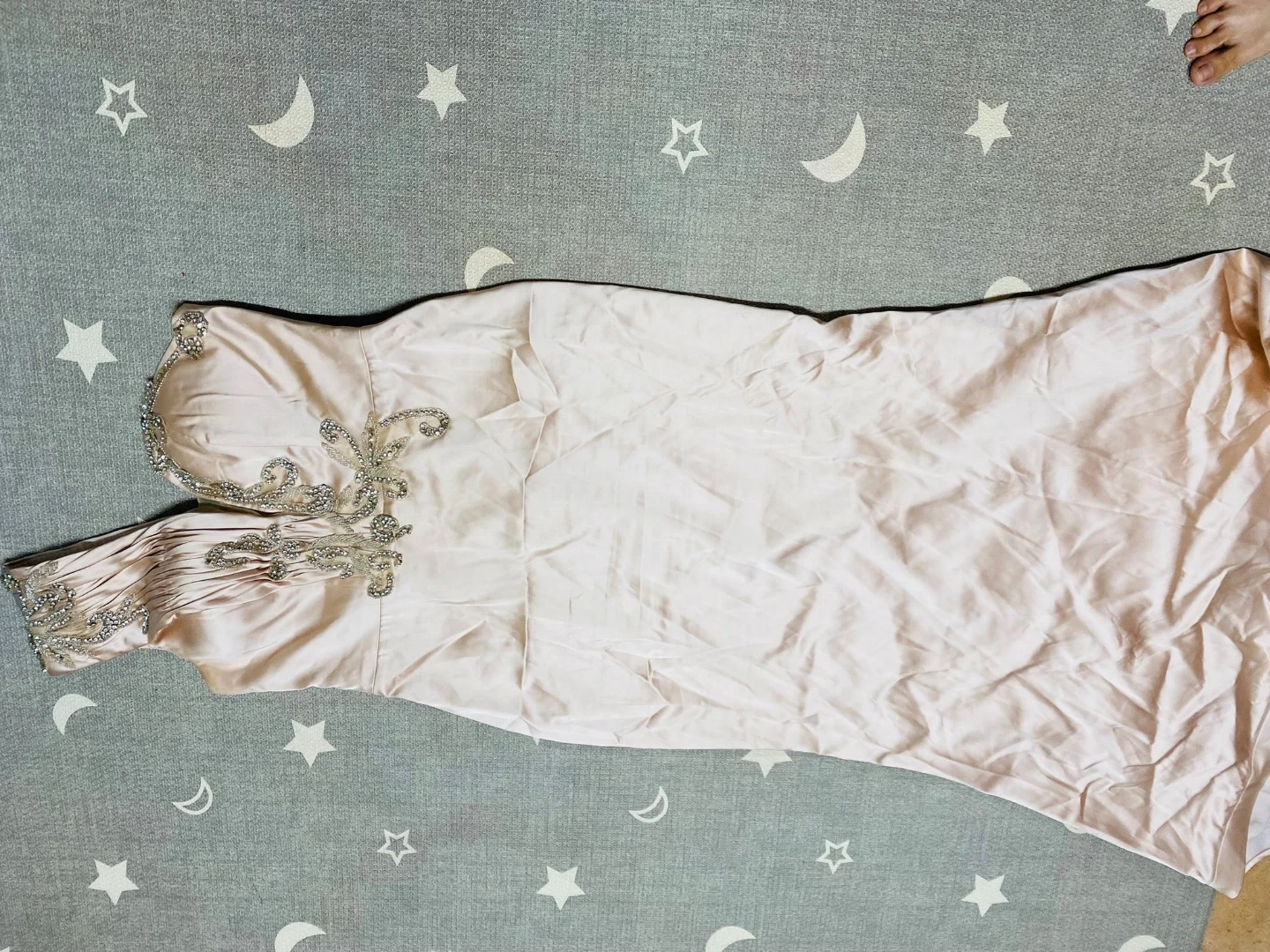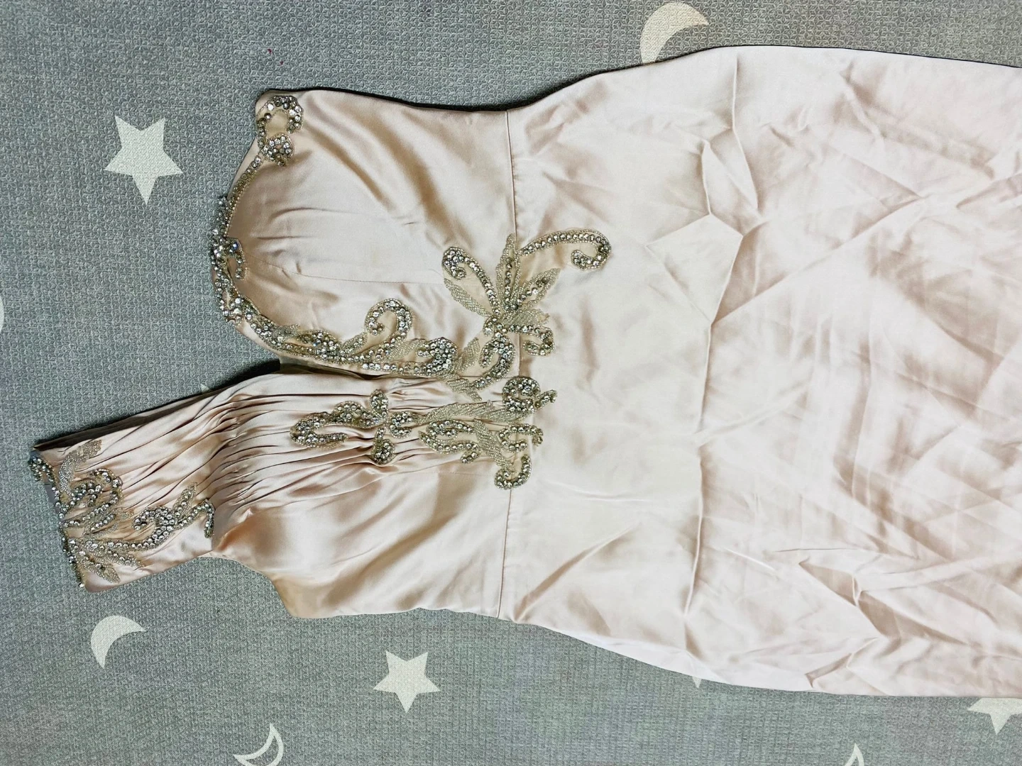 This light pink satin dress features elegant beadwork on the bodice and sleeve. It has a flattering silhouette with delicate ruching details. Perfect for formal events or parties!