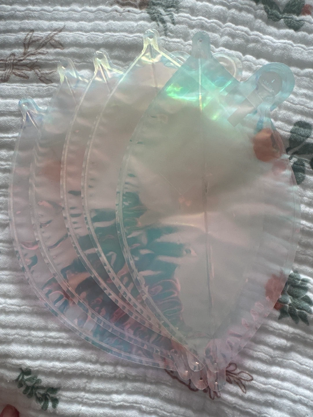 A set of five free iridescent balloons. These are cute and fun for small decorating projects. They have a one way valve style, easy to blow up with a pump and ball inflation style attachment.
