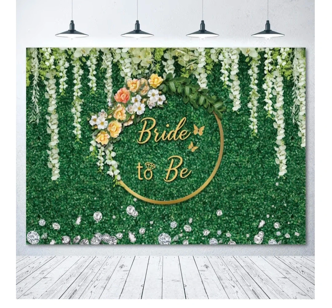 This backdrop features a lush green hedge with elegant floral arrangements and cascading white flowers. It has a gold circle frame with 'Bride to Be' text and sparkly diamond accents. It's perfect for creating a beautiful photo opportunity at a bridal shower or engagement party!