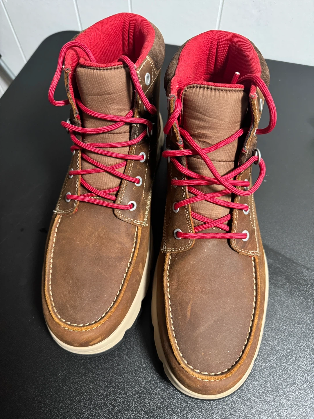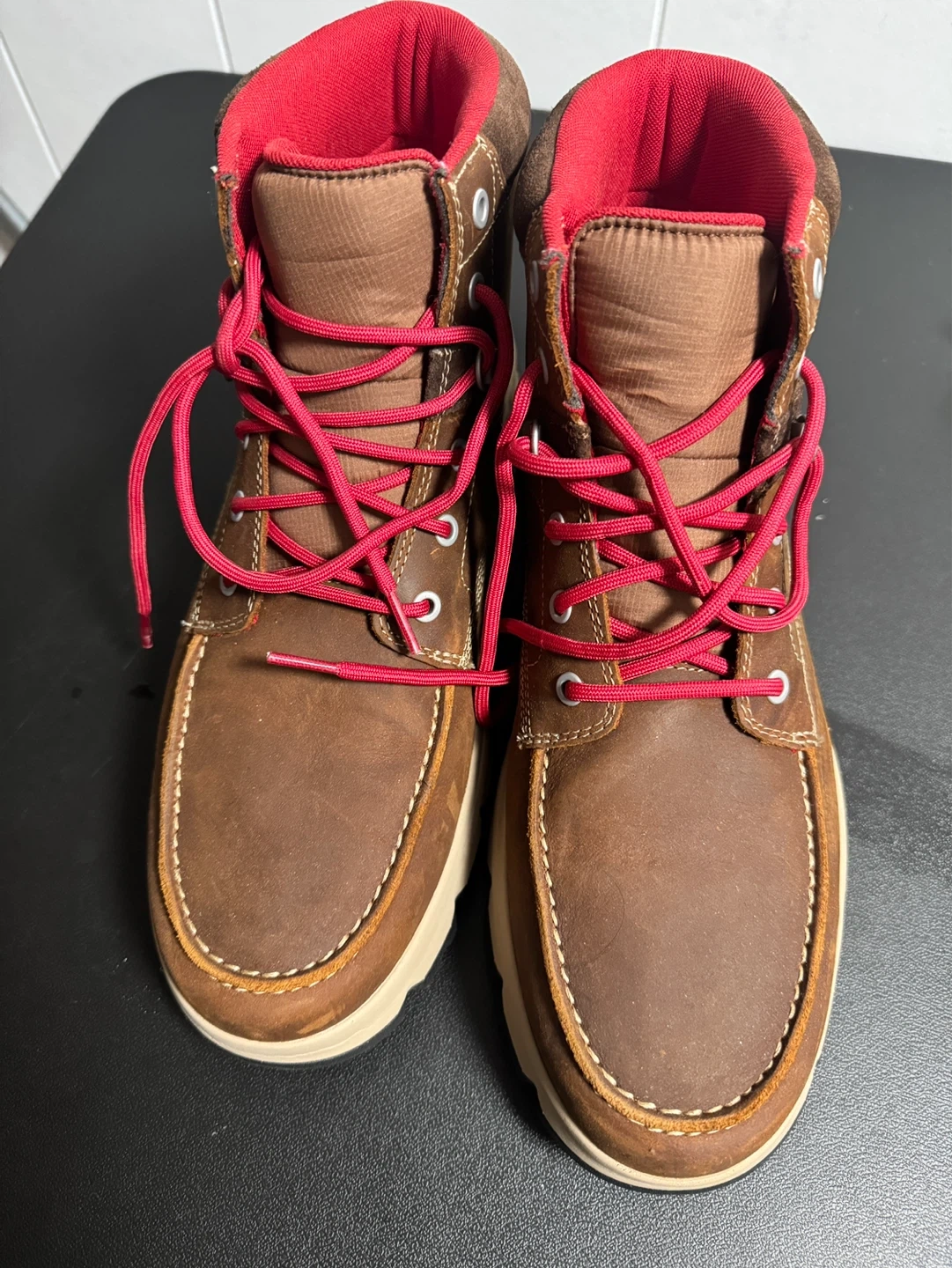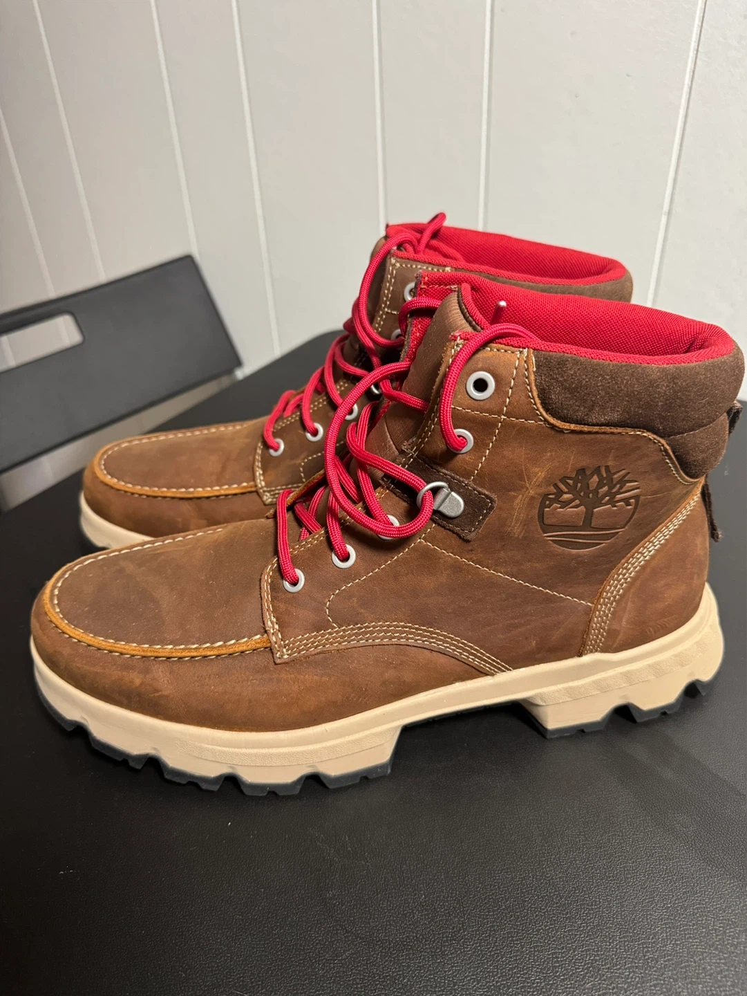 Timberland boots with a durable brown leather exterior. They feature contrasting red laces and lining for a pop of colour. The rugged rubber sole provides excellent traction for various terrains.