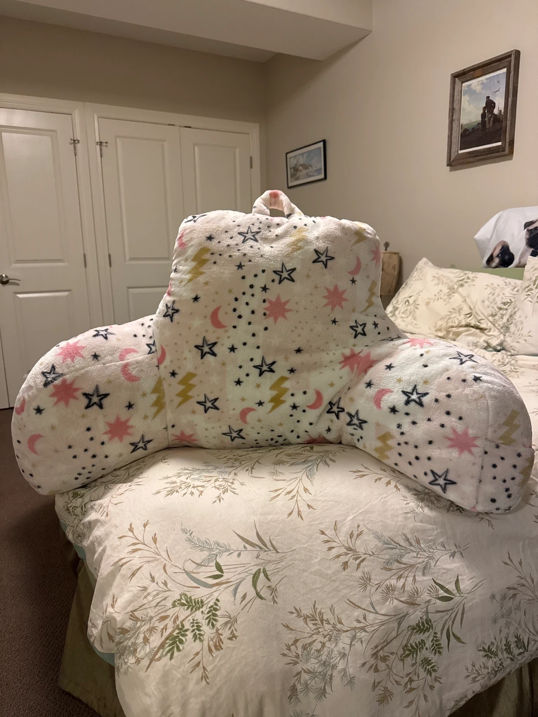 Comfortable reading pillow featuring a fun pattern of stars, moons, and lightning bolts. It has built-in armrests for extra support. The plush material makes it cozy for lounging.