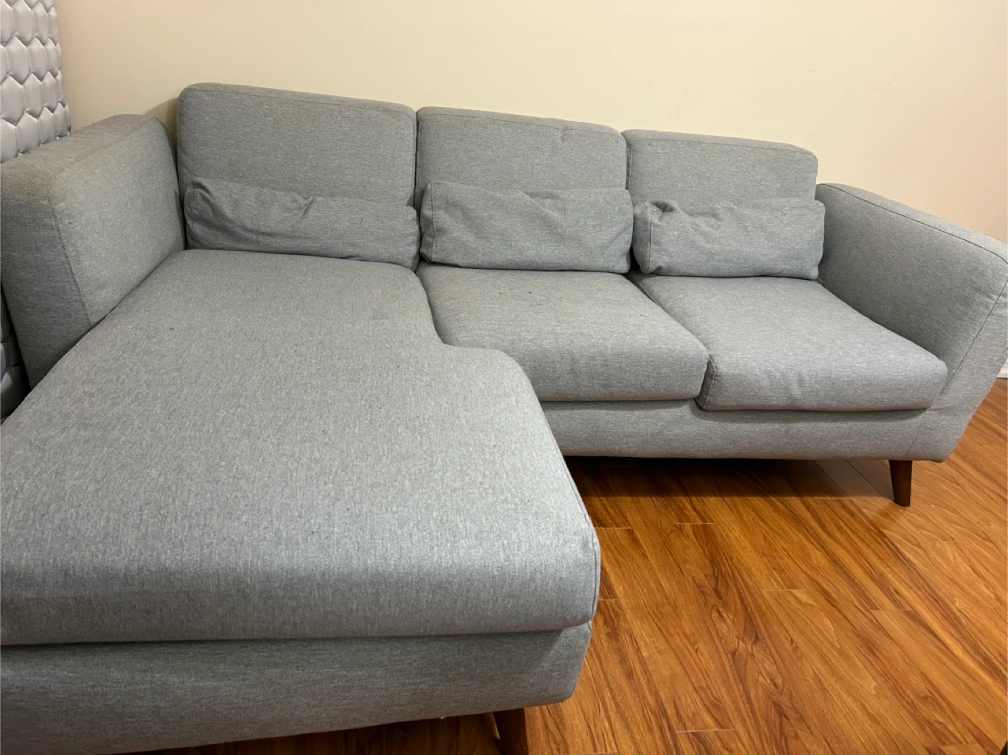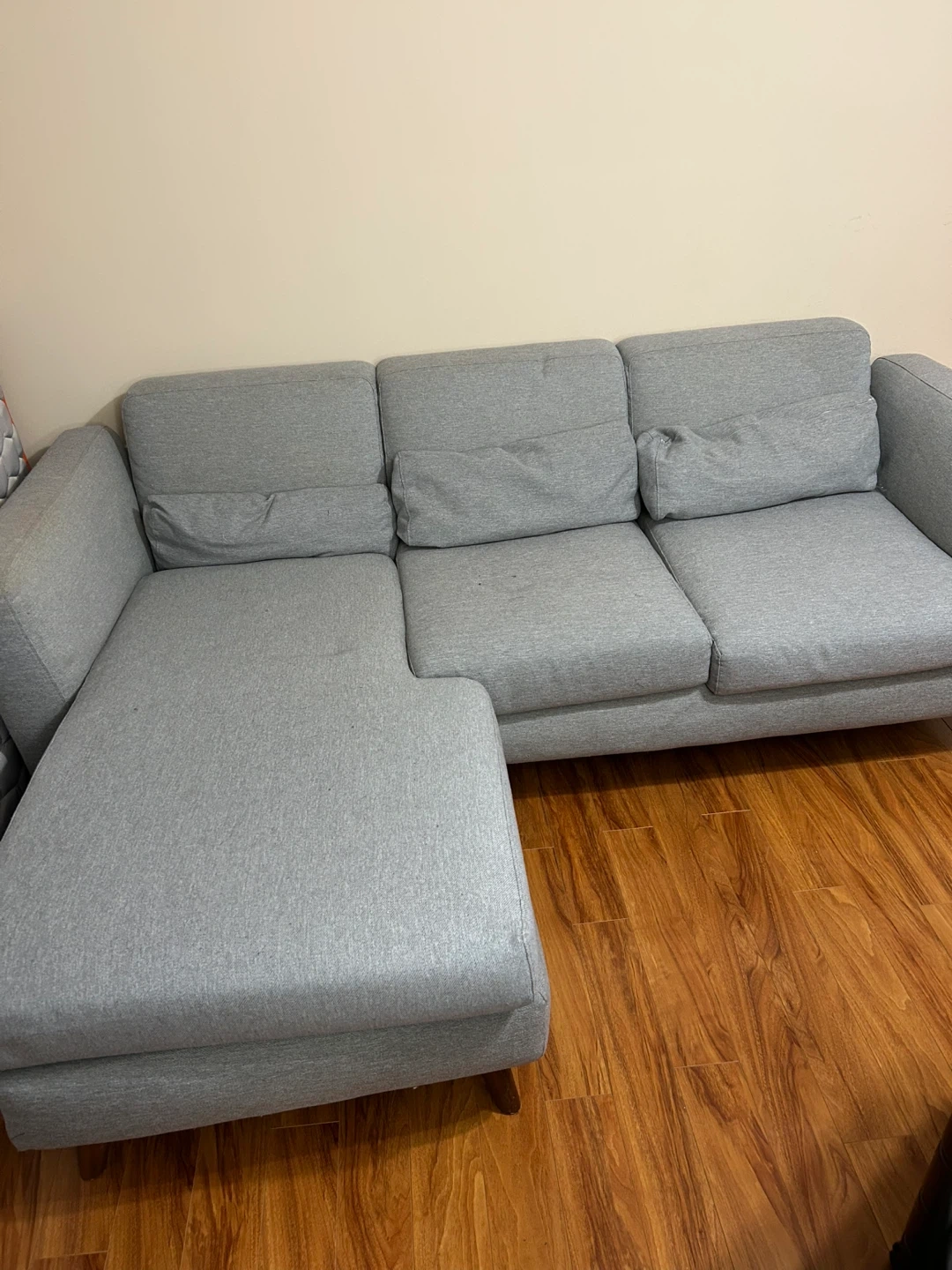 A comfortable grey sectional sofa with modern wooden legs. It's made of durable fabric. This sofa's design offers ample seating for living space.