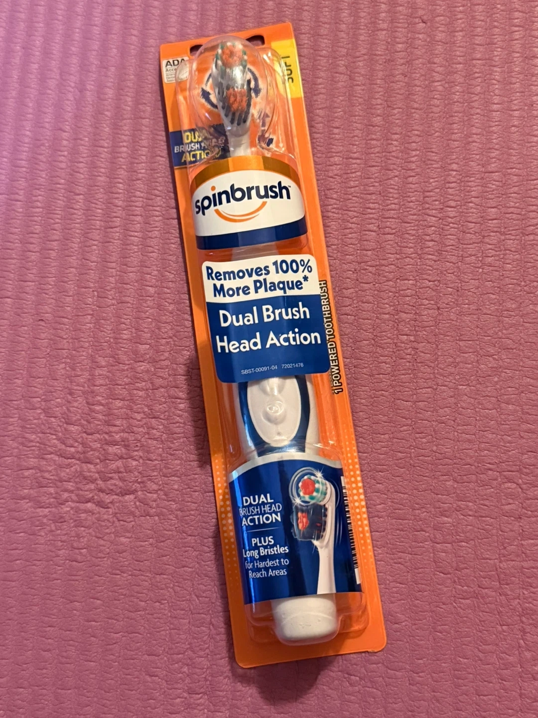 [✨Brand New✨]This Spinbrush PRO+ electric toothbrush features dual brush head action for effective cleaning. It's designed to remove 100% more plaque than a manual brush. Brush heads are replaceable, and the unit requires 2 AA alkaline batteries