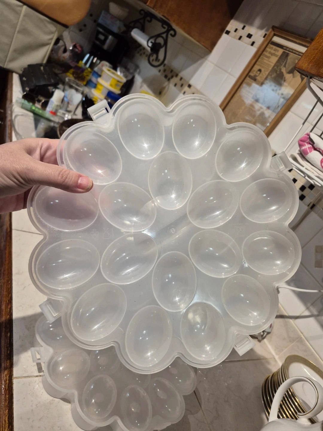 This clear plastic container eggs in individual molded spots. It's made of a flexible plastic material. The lid snaps securely onto the base. It's perfect for storing and transporting eggs safely.