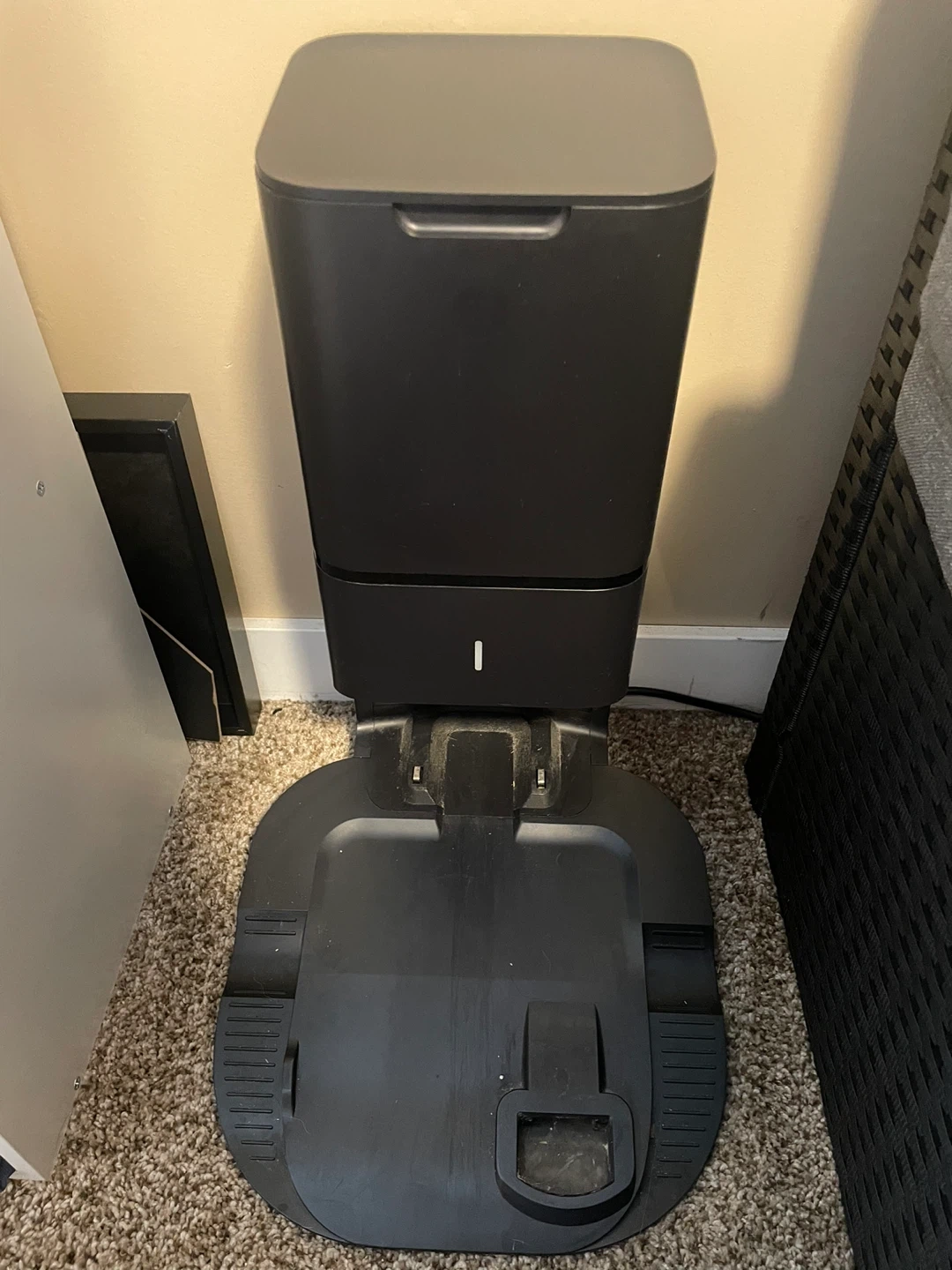 This is an iRobot Roomba Clean Base Automatic Dirt Disposal for select Roomba models. It automatically empties the robot's bin into the base. It's black and grey.