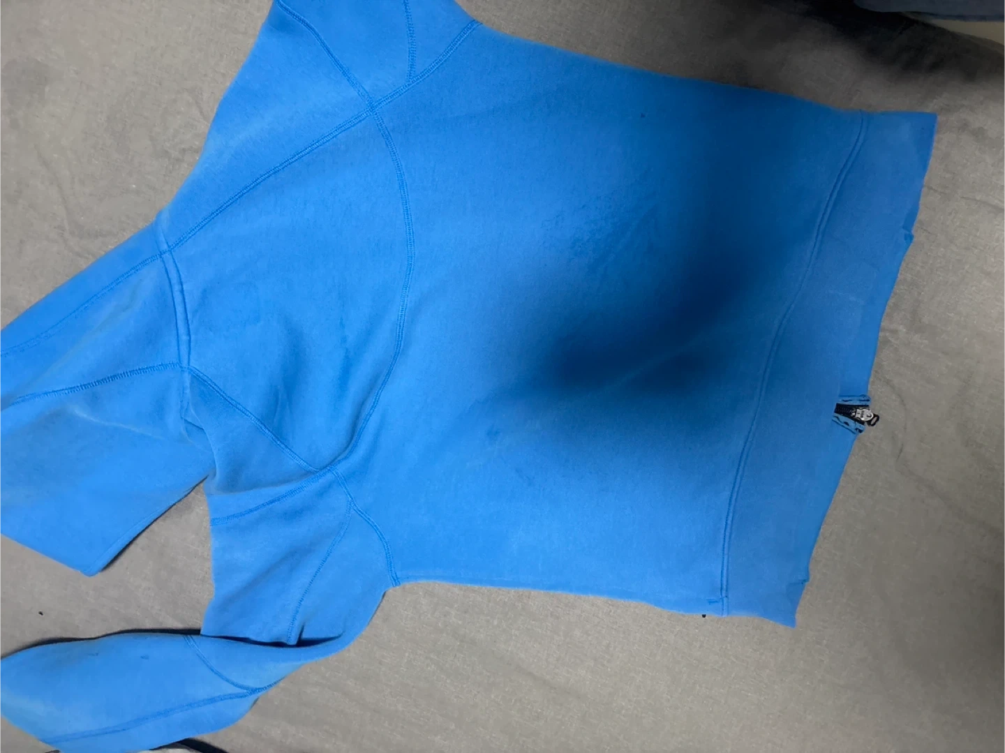This is a blue Nike Tech Fleece zip-up hoodie. It's made from a soft, warm fabric. Features include a full zip closure and pockets.